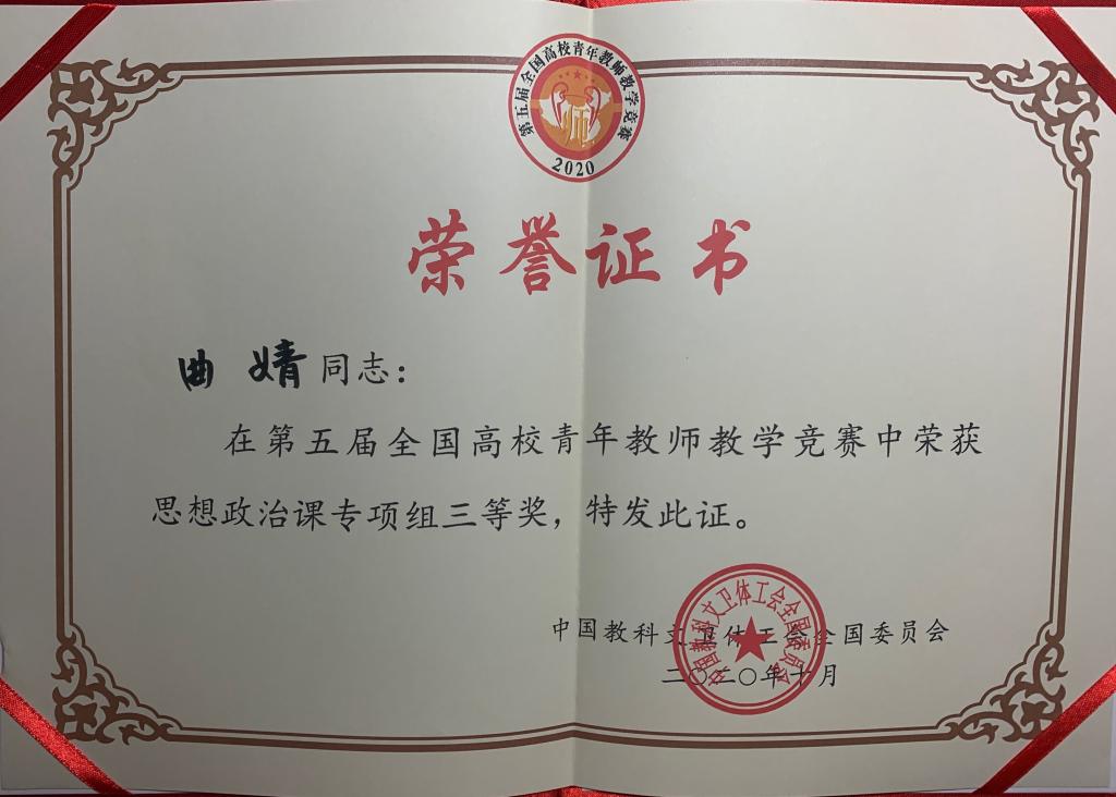 本网讯(教师教学发展中心 供稿)10月28至30日,第五届全国高校青年教师教学竞赛决赛在南京大学仙林校区顺利举办。本次竞赛设立文科组、理科组、工科组、医科组和思想政治课专项组5个组别。吉林省经过层层选拔派出5名教师分别代表5个组别参加全国决赛。kaiyun官网马克思主义学院曲婧教授作为吉林省思政课专项组唯一代表参加了决赛。经过28日、29日两天的激烈比拼,曲婧老师荣获思政课专项组三等奖,创造了kaiyun官网教师参加权威国家级教学竞赛的获奖记录。