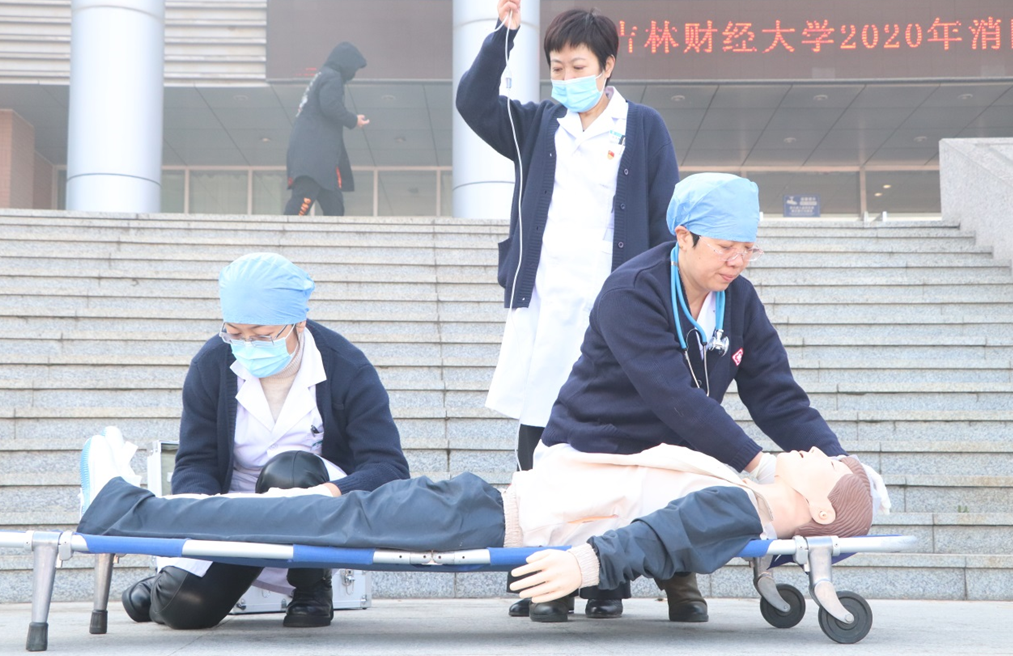 此次消防综合应急演练分为紧急疏散、模拟灭火、应急救援、现场实操等四部分。随着演练总指挥、副校长于金欢下达命令,消防综合应急演练正式开始。情景假设在图书馆三楼阅览室因学生使用劣质充电宝发生火情,校园微型消防站工作人员迅速到达现场,利用室内消火栓进行初期火灾扑救,同时组织学生利用疏散通道、缓降器有序进行疏散。校医院医护人员模拟坠落、踩踏、车辆伤害的情况对学生实施紧急救治。净月区消防救援大队指战员通过中低压水罐消防车水炮、消防云梯水炮、沿楼梯铺设水带和利用楼内消防栓铺设水带等多种方式进行灭火。实操演练由聚业大街消防站站长王楠给大家讲解了灭火器、消火栓的使用方法,并请学生现场体验穿戴消防服和装备。