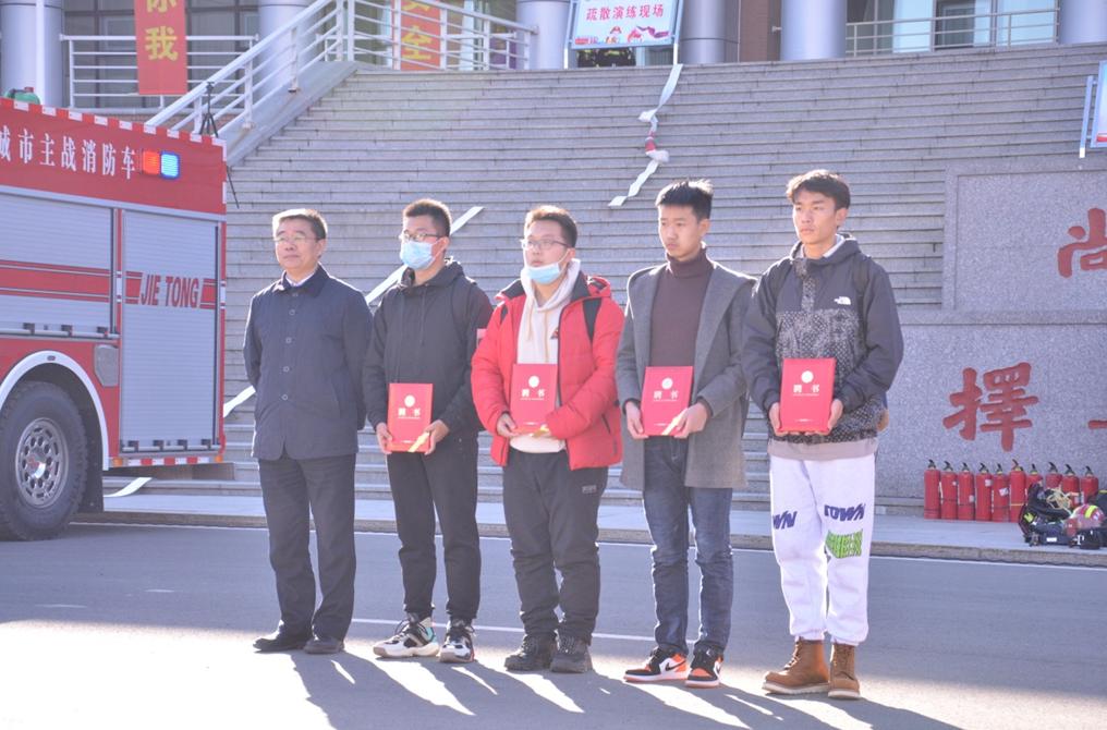 演练过程中,副校长刘鹤为四名2020级新生同学颁发了学校义务消防员的聘书并合影留念。