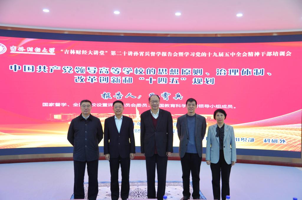 本网讯(科研处 供稿 摄影 宋寄玮 张玥)3月17日下午,全国高校设置评议委员会委员、全国教育科学规划领导小组成员孙霄兵督学应邀做客“吉林财经大讲堂”,在吉林财经大讲堂报告厅作了题为“中国共产党领导高等学校的思想原则、治理体制、改革创新和‘十四五’规划”的报告。会议由校党委副书记、校长孙杰光主持,校党委书记马尚、校党委副书记赵惠敏、副校长刘鹤出席了会议,学校全体中层干部、党委理论学习中心组(扩大)成员同时在线下线上参加了会议。