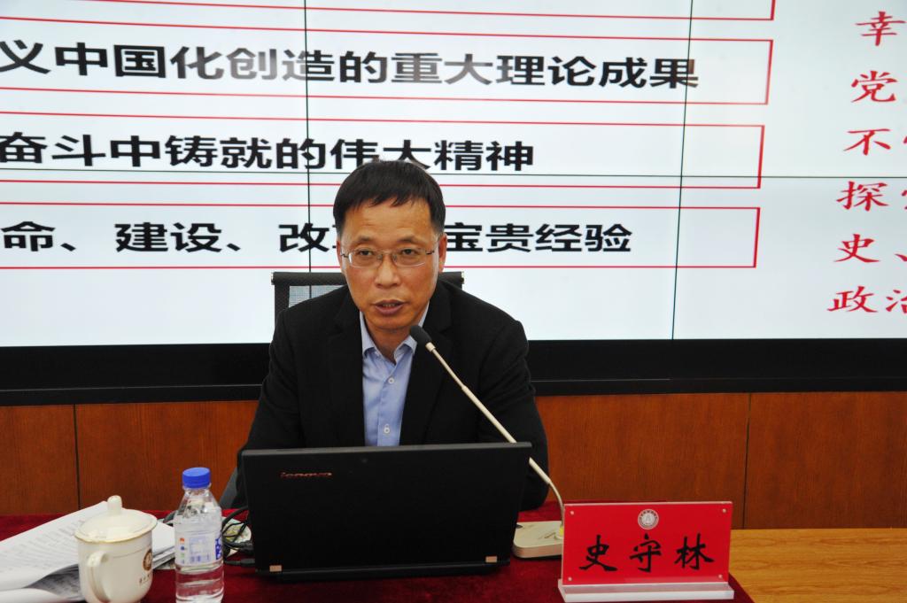 在宣讲中,史守林从深入学习领会习近平总书记关于党史重要论述,充分认识学习党史的重要性;牢牢把握习近平总书记关于党史重要论述的核心要义和根本要求;百年大党在新征程上再出发三个方面,为大家作了一场深入浅出的党史报告。报告中,史守林首先从深入学习领会习近平总书记关于党史的重要论述、充分学习党史的重要性开始,着重介绍了从中国共产党百年历史中感悟初心使命、从中国共产党百年历史中增强信仰信念信心、从中国共产党百年历史中积累自我革命经验、从中国共产党百年历史中提高斗争本领四个方面,带领大家回顾了中国共产党的革命发展历史,他引用习近平总书记重要讲话,列举当今世界发展形势与中国自身发展现状,从初心、思想、理论、实践四个方面指出了学习党史的重要性。随后,史守林从牢牢把握习近平总书记关于党史重要论述核心要义和根本要求方面展开,从领会习近平总书记关于党史的重要观点、重要论断,习近平总书记高度重视四史教育特别是党史教育,从百年党史中汲取前行的力量三个维度,解读了党史发展历程,并通过红色之旅案例,强调要把握党史核心要义与根本要求。最后,史守林从百年大党在新征程再出发,重点强调了百年大党未来更好发展的实践要求:一是感悟思想伟力,深学细悟笃行习近平新时代中国特色社会主义思想;二是树立大历史观,把握历史发展规律和大势,增强系统性预见性创造性;三是深化对党的性质宗旨认识,坚持为人民办实事;四是增强忧患意识,不断提高应对风险挑战的能力水平;五是传承红色基因,发扬革命精神,鼓起迈向新征程、奋进新时代的精气神;六是以强烈的历史担当投身复兴事业。