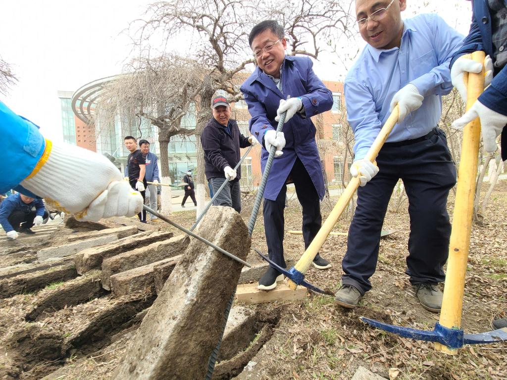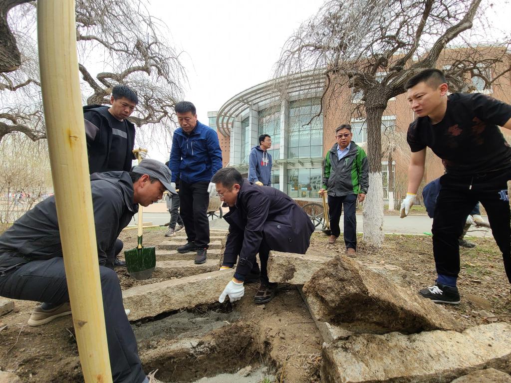校党委副书记、校长孙杰光,副校长于金欢来到现场,亲自指导,给大家加油鼓劲,对后勤党员同志积极为师生解难题、用行动办实事的举措给予了高度肯定,并拿起撬棍,参与到修整条石路的活动中。