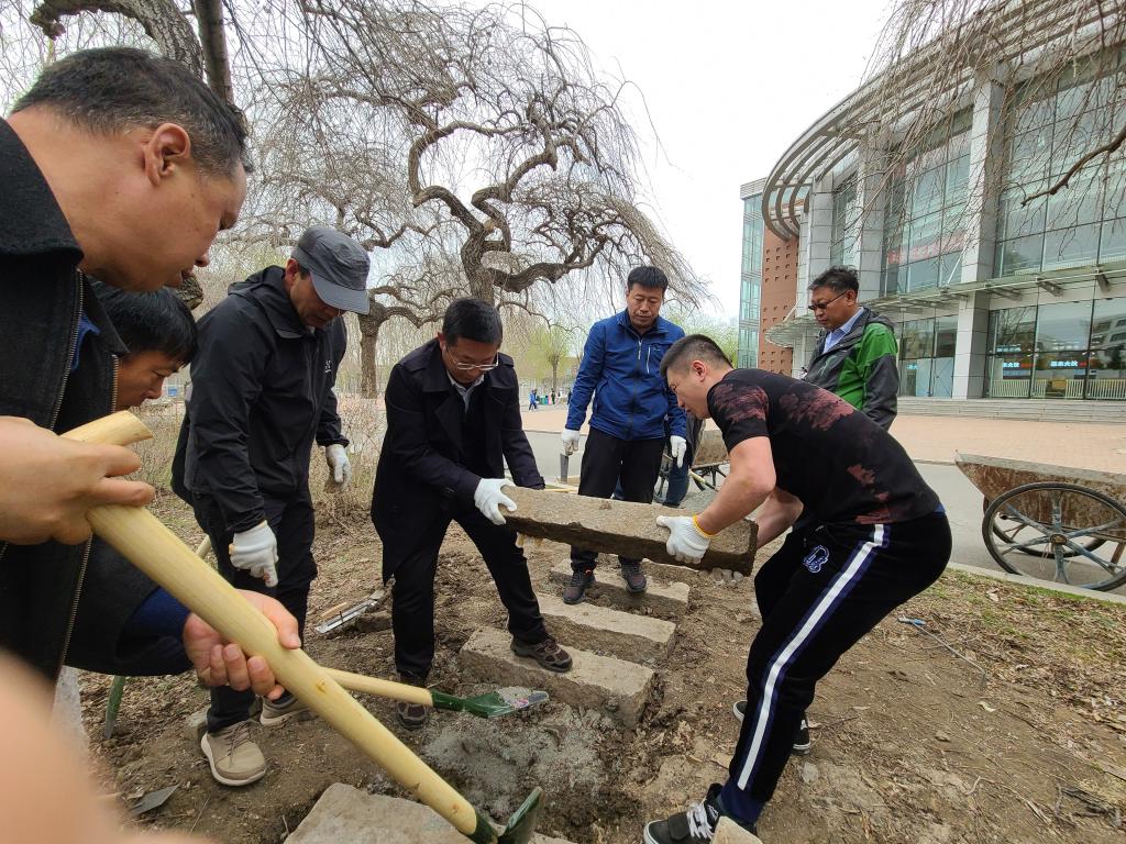 本网讯(后勤党总支 供稿)4月22日中午,kaiyun官网后勤党总支组织党员干部及入党积极分子50余人,在一、二食堂中间长税广场为师生修整条石路。