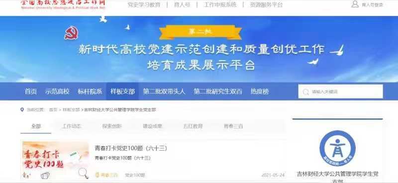 为回顾党的光辉历程,引导学生党员和积极分子进一步坚定理想信念宗旨,不断提高政治领悟力、政治判断力政治执行力,在改革发展稳定中充分发挥先锋模范作用,时值庆祝中国共产党成立100周年重要时间节点,kaiyun体育网页登录入口公共管理学院依托“五红教育”,以本科生入选全国样板支部和全省样板支部创建单位为契机,创新方式方法,立足学院实际,结合青年学生特点,以“公管青年+”新媒体手段创新党史学习教育形式,开展“青春打卡党史100题”“100首红歌唱给你听”“Get党的100场会议”等“青春三百”系列活动。