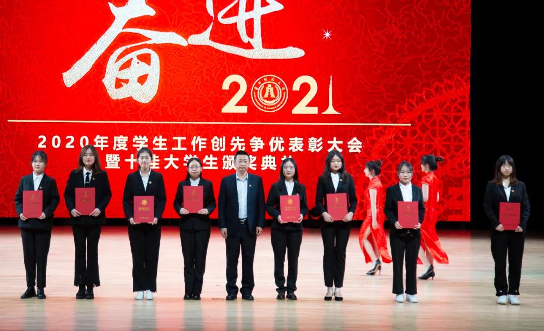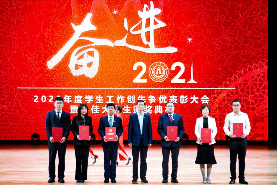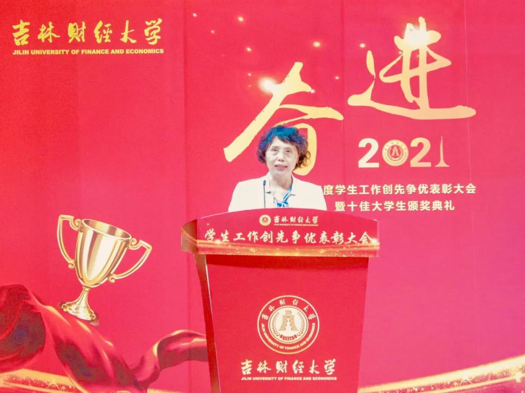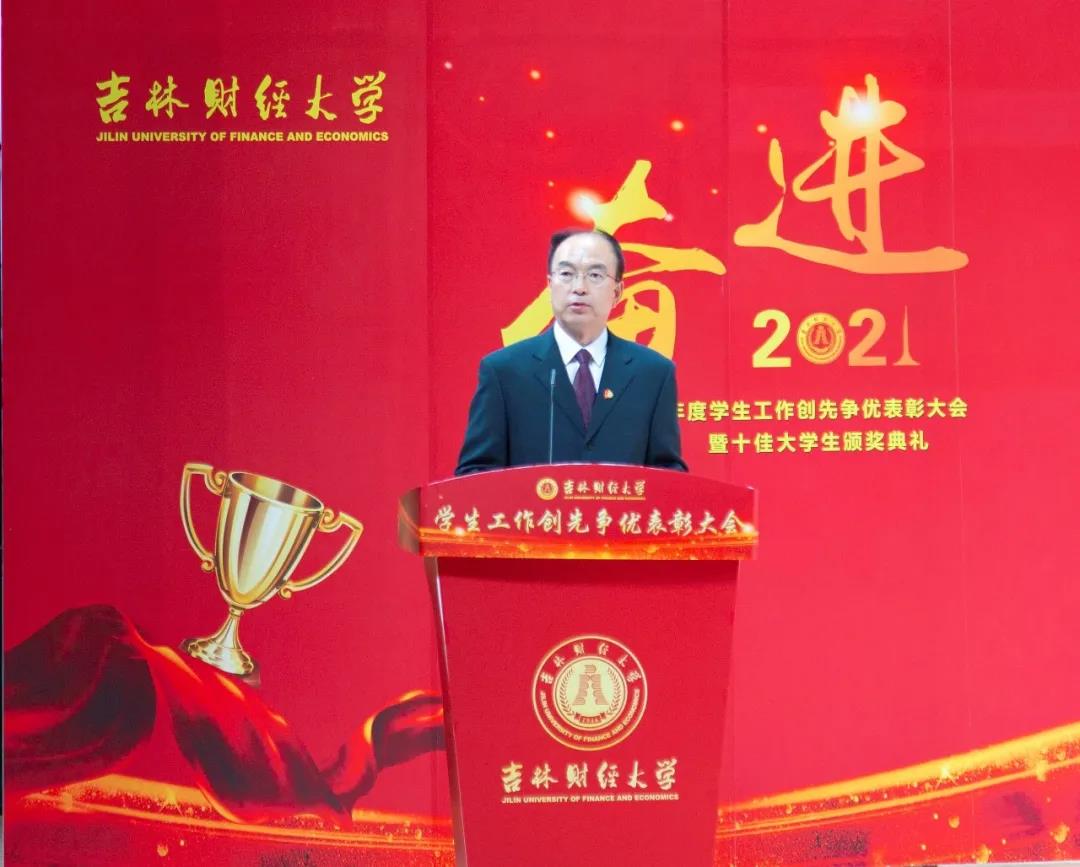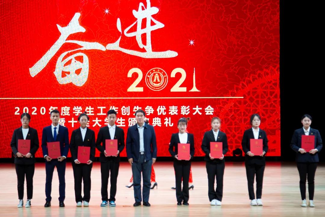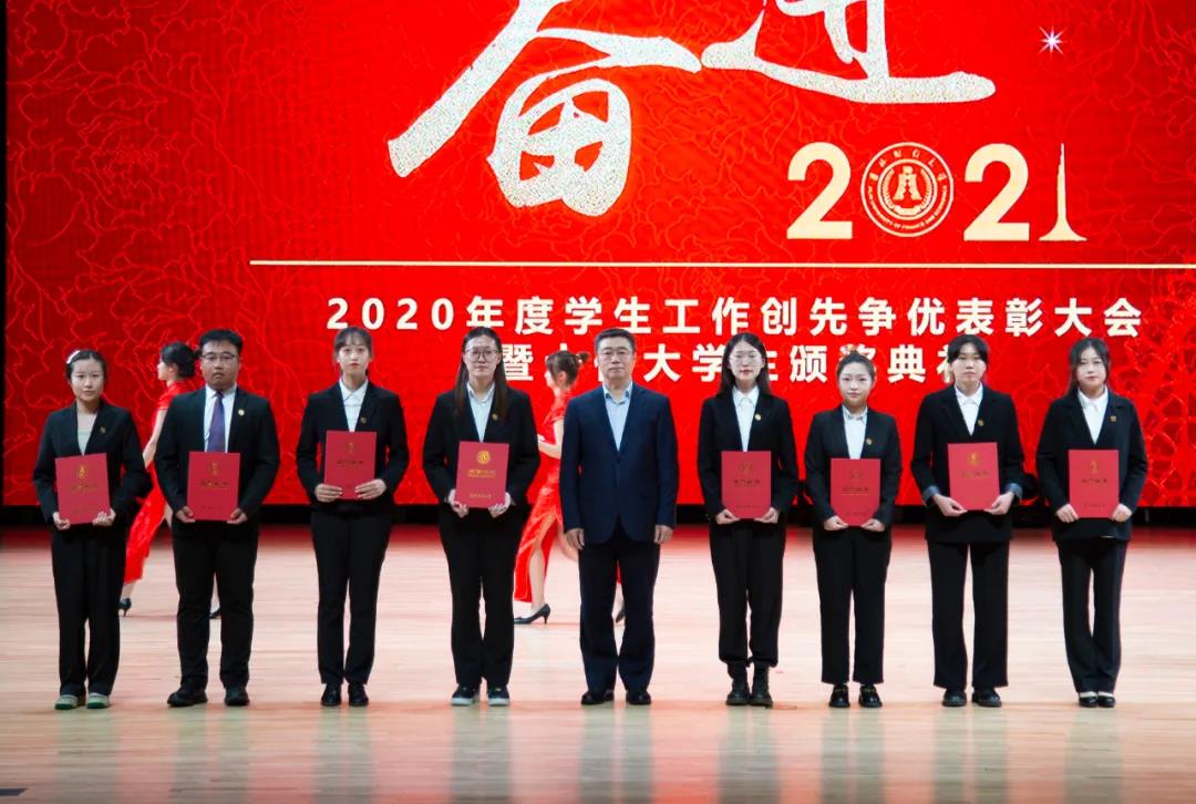大会在雄壮的国歌声中拉开帷幕。首先,学校党委副书记赵惠敏宣读了《kaiyun体育网页登录入口2020年度学生工作创先争优表彰决定》。在2020年度全国高校思想政治工作优秀论文评选中,国际经济贸易学院遇言、亚泰工商管理学院郭旗荣获优秀论文二等奖。在第四届全国大学生网络文化节和全国高校网络教育优秀作品推选活动中,公共管理学院孙之光荣获网络文章三等奖。在长春市高校文明杯评选活动中,国际交流学院、统计学院荣获学生管理工作先进集体荣誉称号;国际经济贸易学院遇言荣获十佳辅导员荣誉称号;国际交流学院贾树彪,党委学生工作部、学生工作处梁志兵荣获学生管理工作先进个人荣誉称号。法学院张漢泽、会计学院李星霖、统计学院郑伟坤、亚泰工商管理学院吴连祥、国际交流学院张筱茹同学荣获长春市百优大学生荣誉称号;九台农商银行金融学院保险1720班、公共管理学院行政管理专业1714班获得长春市文明班级荣誉称号;外国语学院11栋学生公寓614寝室、新闻与传播学院6栋学生公寓626寝室、经济学院5栋学生公寓241寝室、应用数学学院2栋学生公寓435寝室荣获长春市文明寝室荣誉称号。在学校各类评奖评优工作中,税务学院马荣雪、贾婧瑶;九台农商银行金融学院刘宣润、胡佳龙;会计学院刘思妍、齐雨竹;统计学院郝园园;经济学院陈实;国际经济贸易学院李子晴;法学院陈彧;亚泰工商管理学院韩晓、刘昱鸿;外国语学院史岳艳;管理科学与信息工程学院王帆;公共管理学院于靖一;新闻与传播学院王艺凡;国际交流学院于明禾、董笑怡18名同学荣获国家奖学金;会计学院陈曦、统计学院卫一格等336名同学荣获国家励志奖学金;国际经济贸易学院赵碧璇、经济学院孙子涵等56名同学荣获吉林省政府奖学金;外国语学院沈佳睿、公共管理学院陈小单等29名同学荣获校长奖学金;九台农商银行金融学院季悦、国际交流学院林雨欣等14名同学荣获亚泰优秀本科学生奖学金;新闻与传播学院张心怡、管理科学与信息工程学院李建坤等13名同学荣获亚泰励志奖学金。法学院贾珺等338名同学荣获校优秀学生干部荣誉称号;应用数学学院吴秋悦等508名同学荣获校三好学生荣誉称号;税务学院财政1904班等24个学生班级荣获校先进班级荣誉称号;亚泰工商管理学院7栋学生公寓412寝室等103个寝室荣获校文明寝室荣誉称号。宣读表彰决定后,学校领导向获奖集体和个人颁发了荣誉证书。