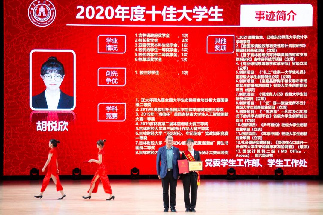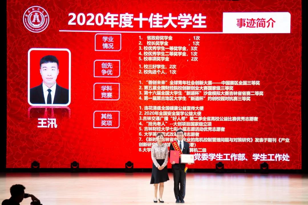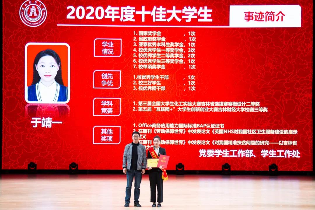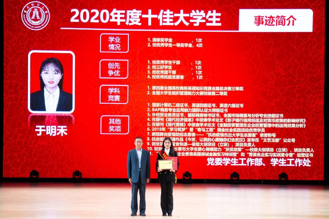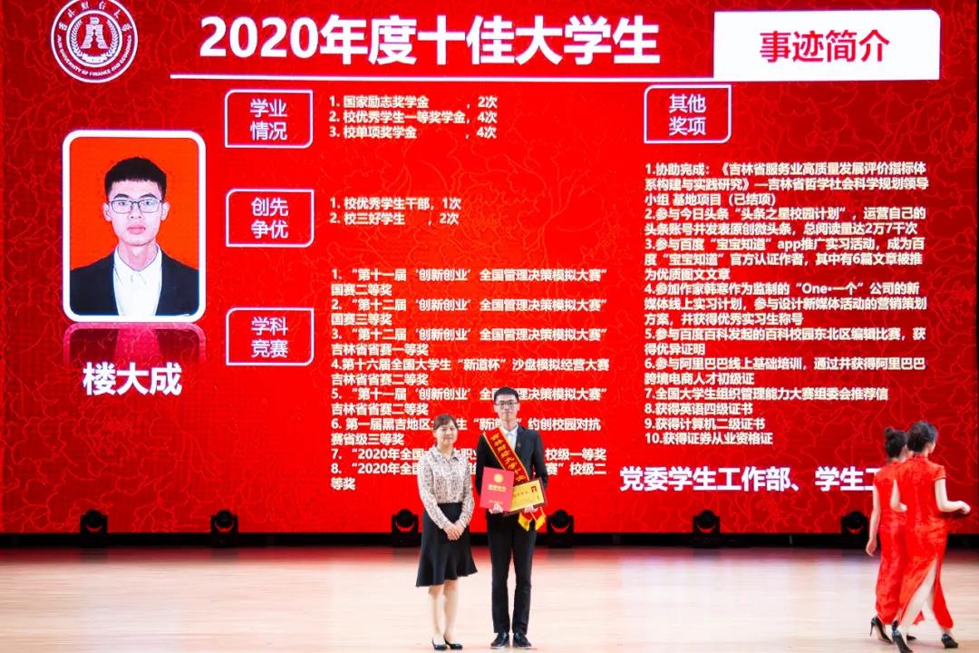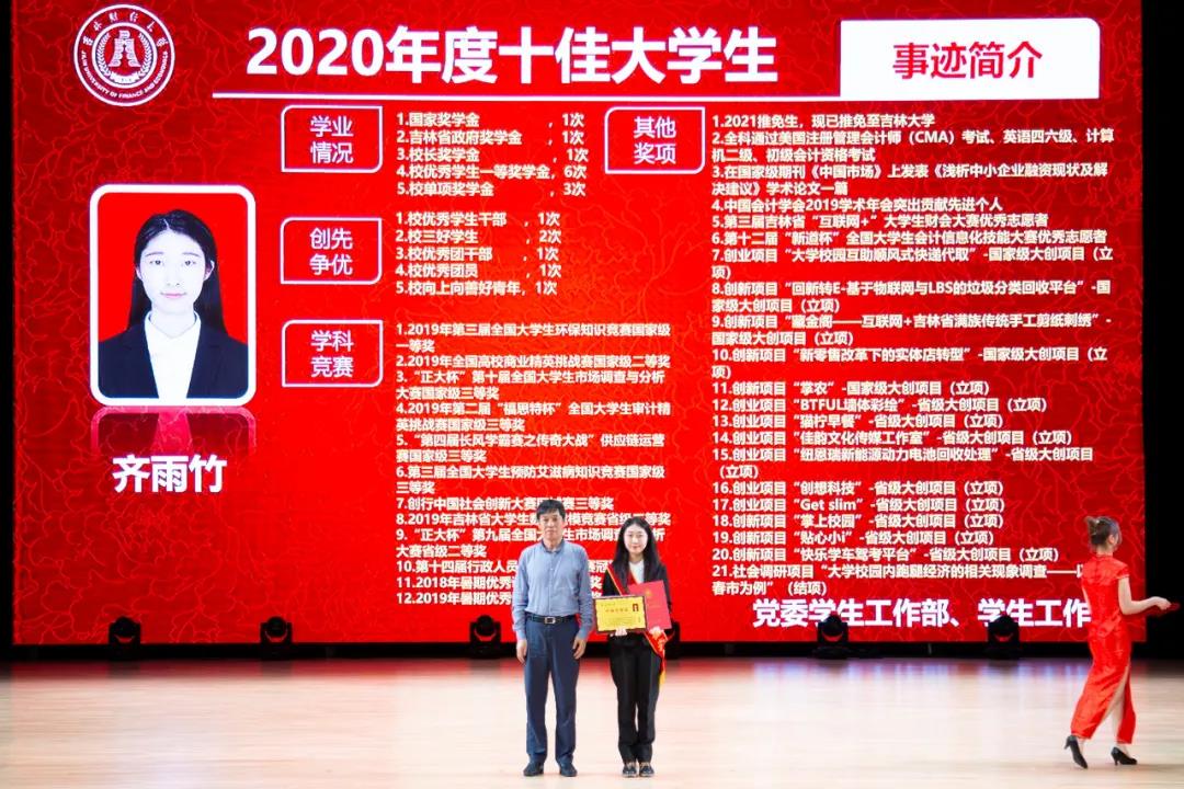在随后进行的“十佳大学生”颁奖典礼仪式上,统计学院胡悦欣、国际交流学院于明禾、会计学院齐雨竹、应用数学学院牟洋琳、管理科学与信息工程学院毋馨敏、九台农商银行金融学院娄云深、税务学院马荣雪、亚泰工商管理学院王汛、公共管理学院于靖一、亚泰工商管理学院楼大成十名荣获2020年度“十佳大学生”荣誉称号的同学受到了表彰。“十佳大学生”辅导员为他们宣读了颁奖词,各学院党委、党总支书记为本学院“十佳大学生”颁发了奖牌和荣誉证书,获奖学生发表了感言,表达了自己获得这一殊荣的欣喜和对学校培养的感激之情。