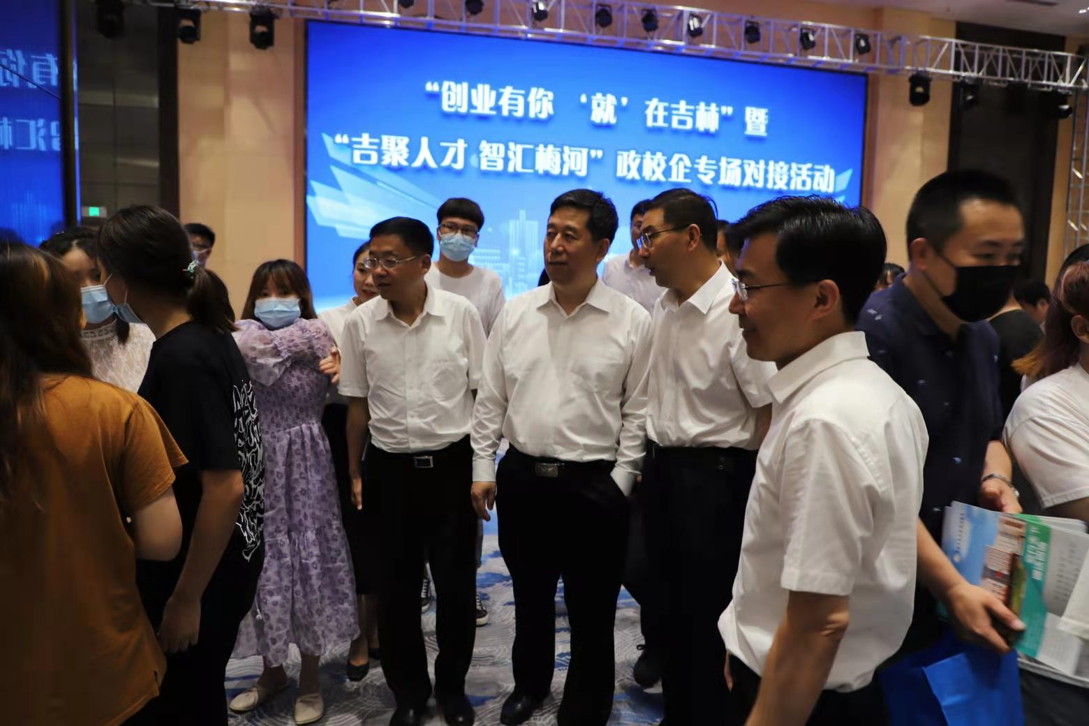 本网讯 (招生就业处 供稿)7月14日,“创业有你‘就’在吉林”暨“吉聚人才 智汇梅河”政校企对接交流活动在梅河口市国际会议会展中心举行。省人社厅副厅长张立福,省政府教育督导委员会总督学岳强,省人才中心副主任郭毅,梅河口市委副书记、市长牟大鹏,kaiyun官网党委副书记、校长孙杰光,副校长刘鹤以及吉林大学、东北师范大学等50余所高校代表共计600余人参加活动。