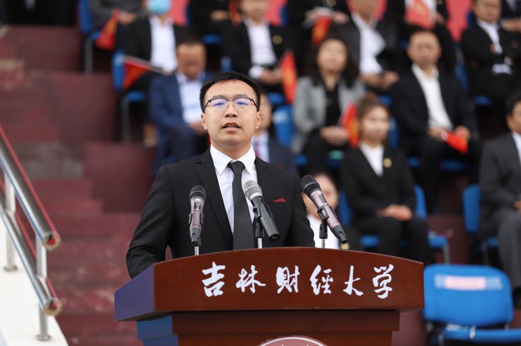 会计学院团委书记、2021级新生辅导员王萌代表全体辅导员发言。他表示,从一名吉财学生到一名吉财工作者,见证了吉财会计的发展历程。在百年华诞的历史节点上,与吉财的相遇,意义非凡。在未来,希望同学们能成为信仰坚定、志存高远的爱国者;终身学习的奋斗者;敢想敢做的实干者;敢于担当、充满爱心的大爱者。在大学中找到自我,找到方向,勇往直前。