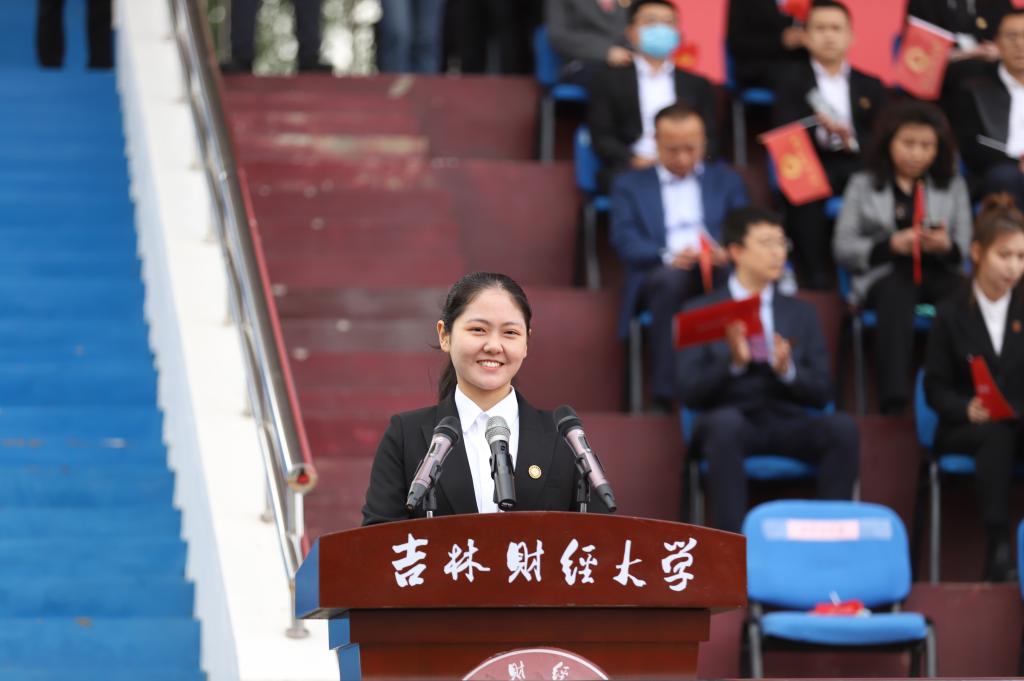 统计学院经济统计2163班徐毓鸿同学代表2021级本科生发言。她表示,作为新时代青年,应坚定理想信念,紧跟时代步伐,担起实现中华民族伟大复兴的历史重任。