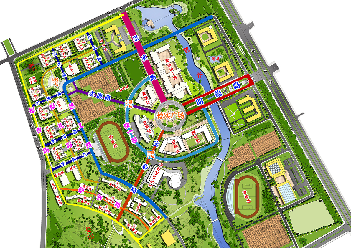 街路名字来源于学校“德、实、学、善”的学校文化内核和“明德崇实”的校训精神,将学校东门主路命名为“明德路”,将北门主路命名为“崇实路”,将学校南门主路命名为“学信路”;学校环行路,以“德”字开头,分别与“仁、义、礼、智、善、真、俭、谦”进行有序组合,分别命名为德仁路、德义路、德礼路、德智路、德善路、德真路、德俭路和德谦路;学校直行路,以“实”字开头,分别与“忠、孝、诚、勇、和、廉、恭、勤”进行有序组合,分别命名为实忠路、实孝路、实诚路、实勇路、实和路、实廉路、实恭路和实勤路。以上路名详细设置以路牌为准。