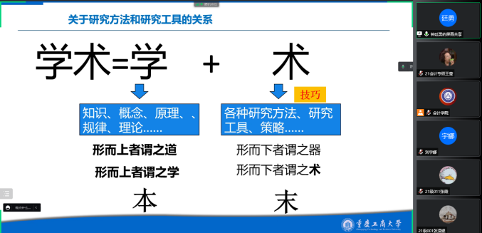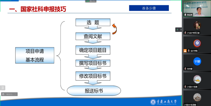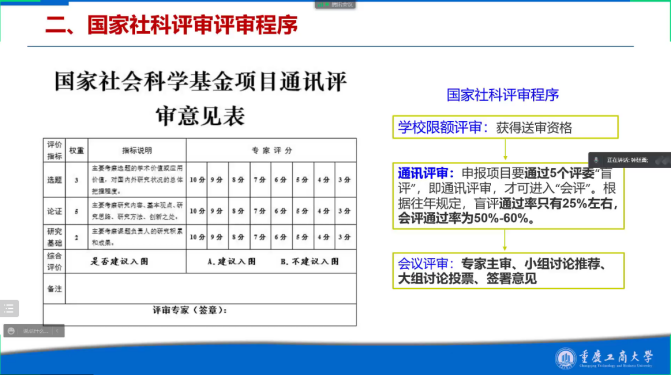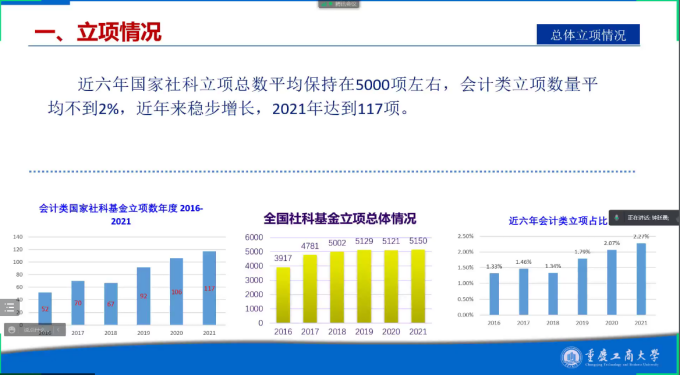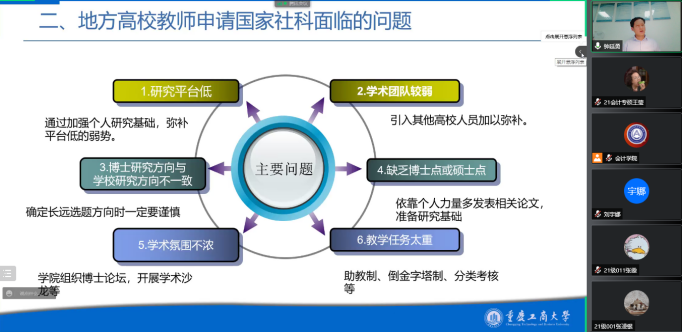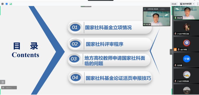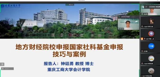 本网讯(会计学院 供稿)10月20日下午18:00,重庆工商大学教授、博士、博士后、重庆英才、青年拔尖人才钟廷勇老师应kaiyun官网会计学院邀请,以线上腾讯会议的方式为我院师生作题为“地方财经院校申报国家社科基金申报技巧与案例”的学术报告。本次会议由会计学院专硕教育中心主任苏宏伟老师主持。与会人员主要包括会计学院教师、2020、2021级学术研究生、本科科研班同学参与聆听。