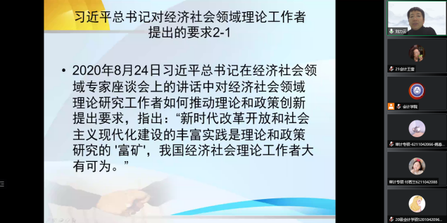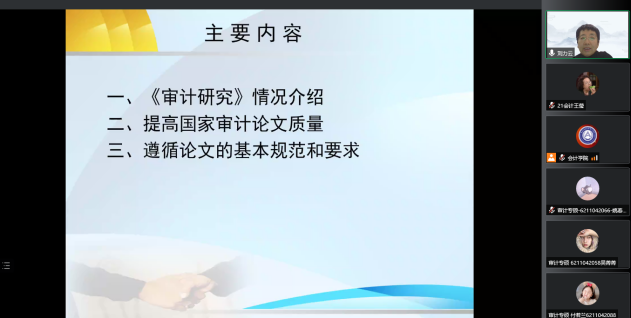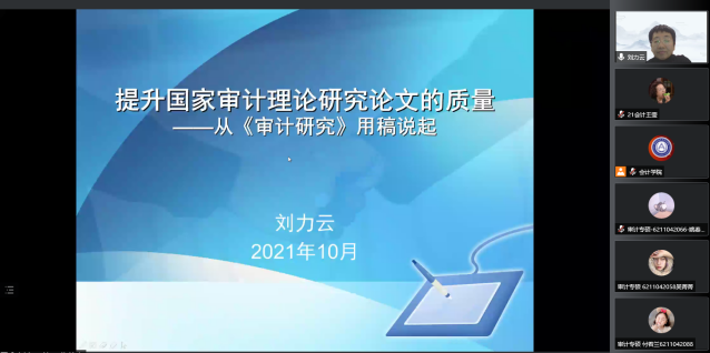 本网讯(会计学院供稿)10月27日下午18:00,审计署审计科研所副所长刘力云研究员应受kaiyun官网会计学院的邀请,以线上腾讯会议的方式为我院师生作出主题为“提升国家审计理论研究论文的质量——从《审计研究》用稿说起”的学术报告。本次会议由会计学院院长梁毕明教授主持,与会人员主要有会计学院教师、2020、2021级全日制研究生共同参与聆听。