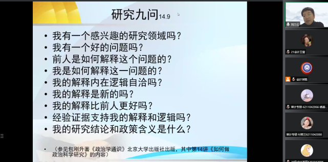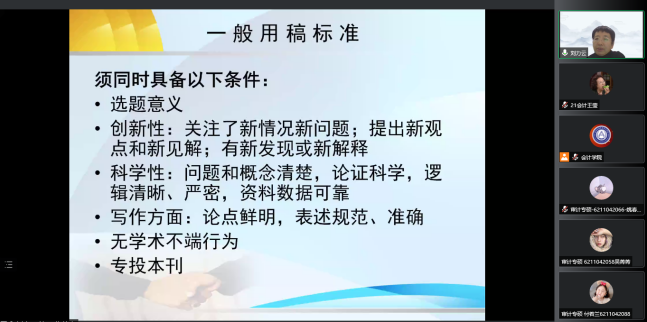 刘力云研究员的学术报告分为《审计研究》情况介绍、提高国家审计论文质量、遵循论文的基本规范和要求的三个部分,并且结合了当下中国国情的现状和自身实践的经验,向参与报告的师生分享心得体会。