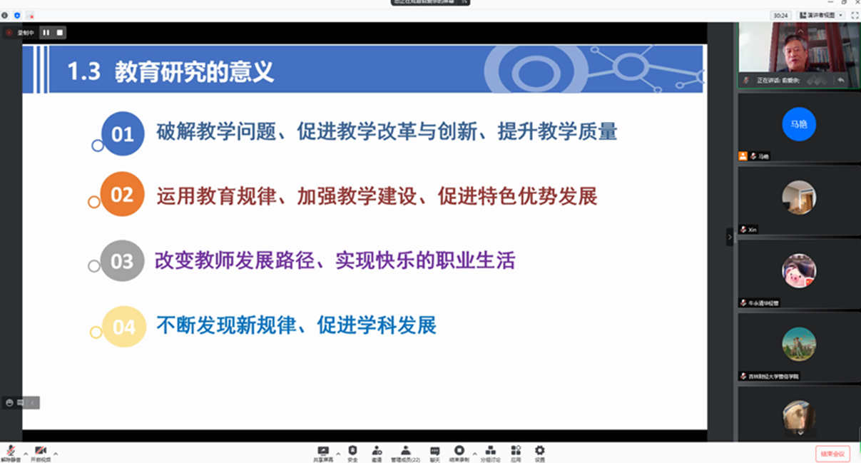 本网讯(管信学院 供稿)11月3日,应管信学院邀请,延边大学师范学院院长俞爱宗教授通过腾讯会议作了题为“高校教研活动中的选题与课题设计”的学术报告。报告会由管理科学与信息工程学院副院长姜建华主持,学院教师通过线上、线下两种方式参加了本次报告会。
