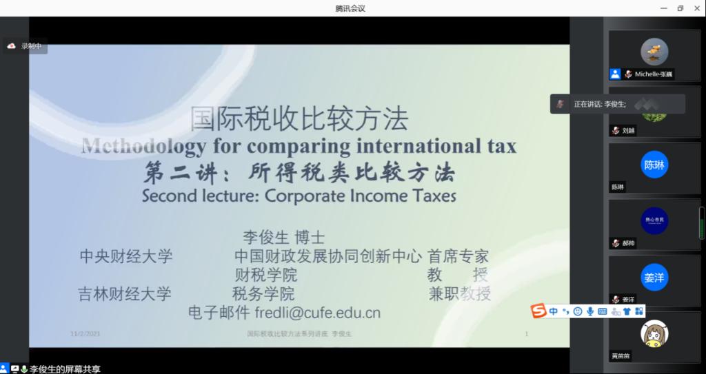在第二节的课程中,李教授讲述了在运用方法进行国际税收比较时,可以从税制、税务类别确立实证为切入点进行了讲解。列举了国际税收比较切入点的选择依据以及比较国际税制的观测点、观测变量。接着概述了公司所得税和个人所得税,从公司所得税边际税率、成本补偿办法、税收优惠条款与税制复杂程度,分析国际上的指标体系是如何设立的。