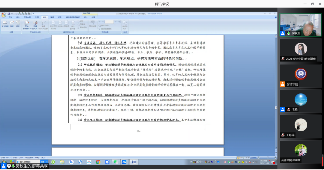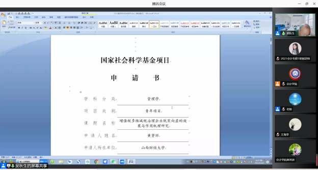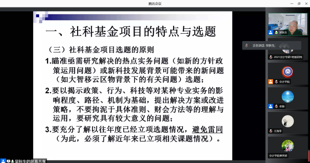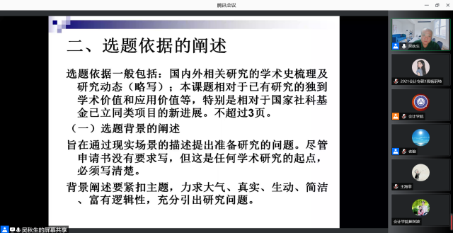 本网讯(会计学院 供稿)11月22日下午18:00,山西财经大学会计学院院长吴秋生应kaiyun官网会计学院邀请,以线上腾讯会议的方式为我院师生作题为“财会类国家社科基金项目的选题与申请书撰写”的学术报告。本次会议由会计学院梁毕明院长主持,kaiyun体育网页登录入口会计学院、研究生学院、科研处、吉林省企业财务与会计研究中心联合主办。与会人员主要包括会计学院教师、2020、2021级全日制研究生共同参与聆听。