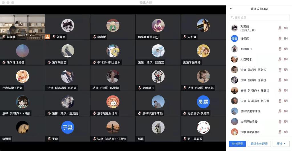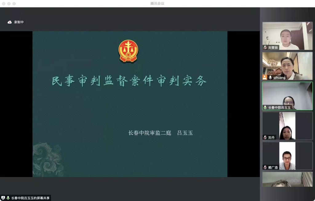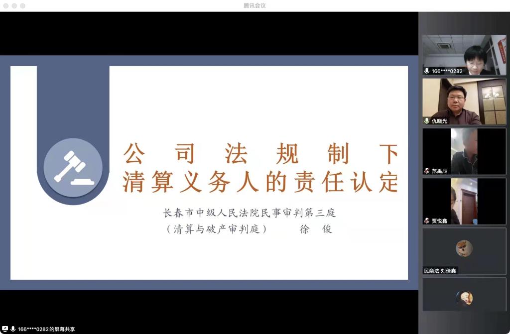 此次实务课程法硕中心邀请了校外实务导师长春市中级人民法院知识产权庭副庭长单艳芳、审判监督二庭副庭长吕玉玉、民事审判第三庭(清算与破产审判庭)副庭长徐俊、刑事审判庭第一庭四级高级法官祝仰辉、北京市中伦律师事务所金光辉律师开讲。中心邀请与讲座主题研究方向较为契合的赵鑫、齐衁、刘雯丽、王喆、金洪亮五位老师分别任讲座主持人。法学院仇晓光院长、王开宇副院长、法硕中心办公室主任刘雯丽博士全程参与。法学院党委副书记高原、团委书记赖广添、辅导员马冬梅、姚佳明积极组织法学院研究生、本科生累计近千人线上参加,多位法学院教师以及我院毕业生参加讲座,学术气氛热烈浓厚。
