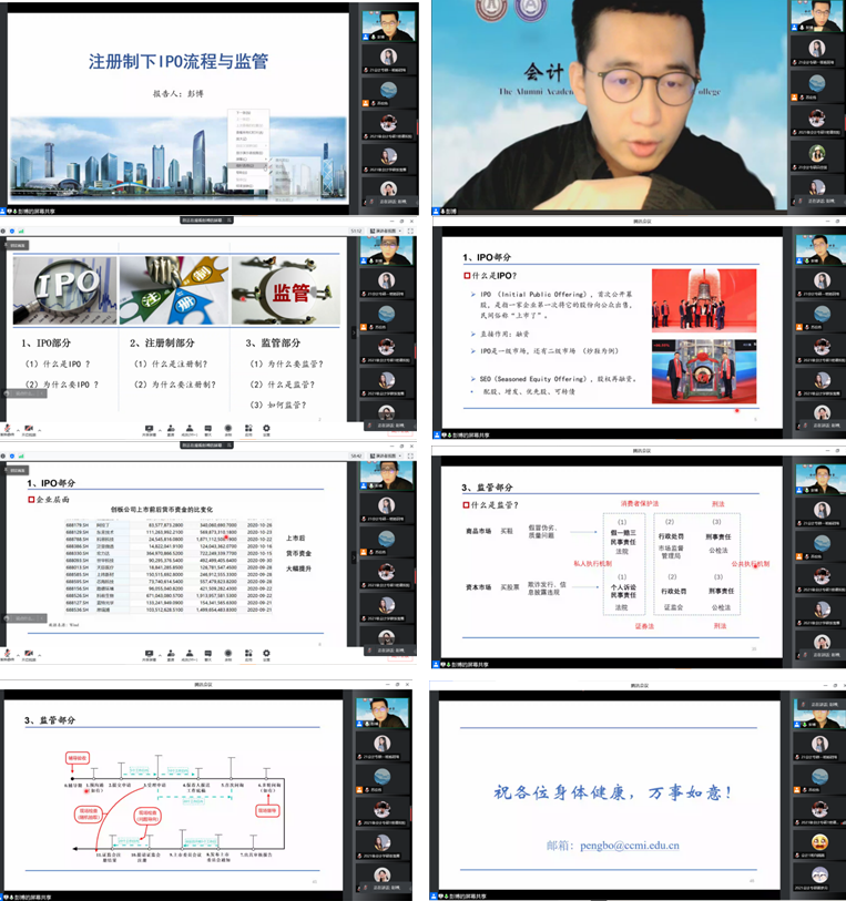 本网讯(会计学院 供稿)疫情特殊时期,为丰富和充实研究生业余活动和提升科研水平,加强疫情期间会计学子的思想引领和教育教学, 全面做好疫情防控工作,kaiyun体育网页登录入口会计学院举行党旗领航共抗疫,守护校园创平安”系列校友活动,主要组织优秀校友开展系列专题讲座。3月28日下午18:00,由证监会资本市场学院与厦门大学联合培养博士后、东北财经大学会计学博士研究生、kaiyun体育网页登录入口会计学院2016届会计硕士研究生彭博,以线上腾讯会议的方式为我院学生作主题为“注册制下IPO流程与监管”学术报告。本次会议由会计学院专硕教育中心主任苏宏伟老师主持,会计学院2020、2021级全日制研究生以及部分本科生总计三百余人共同参与聆听。