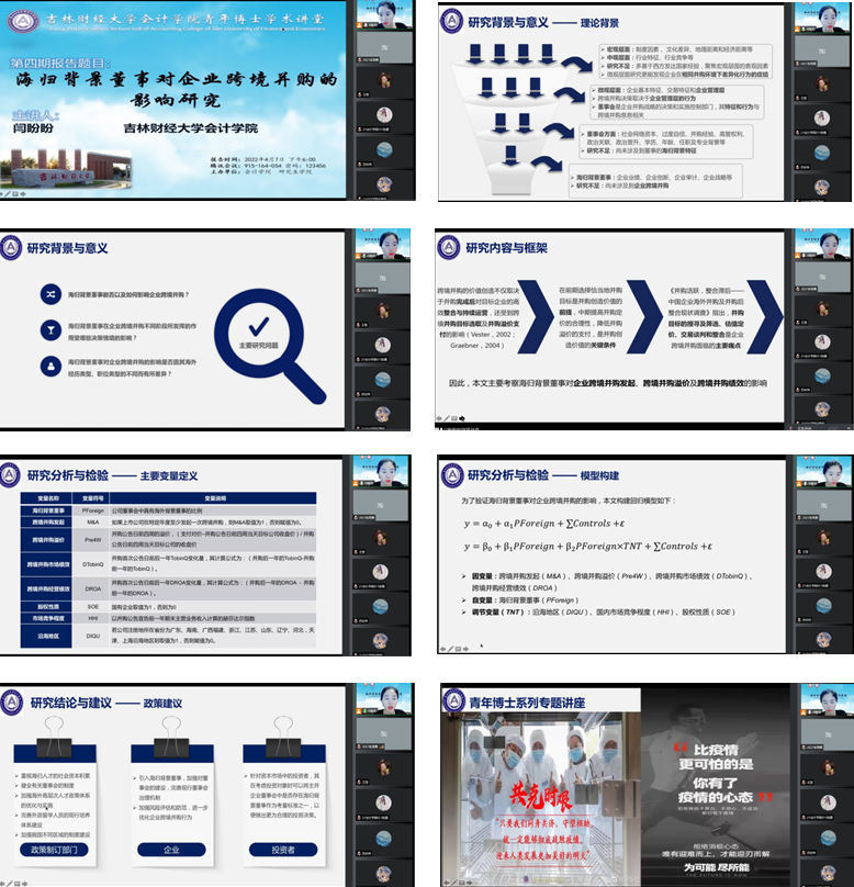 本网讯(会计学院 供稿)疫情特殊时期,为丰富和充实研究生业余活动和提升科研水平,kaiyun体育网页登录入口会计学院举行“疫路相伴,春暖花开”党员教师系列导学讲座,主要组织青年博士开展系列专题讲座。4月7日下午18:00,本次由会计学院闫盼盼老师以线上腾讯会议的方式为我院学生作出主题为“海归背景董事对企业跨境并购的影响研究”学术报告,该次会议由会计学院副院长王丽南老师主持,会计学院2020、2021级全日制研究生共同参与聆听。