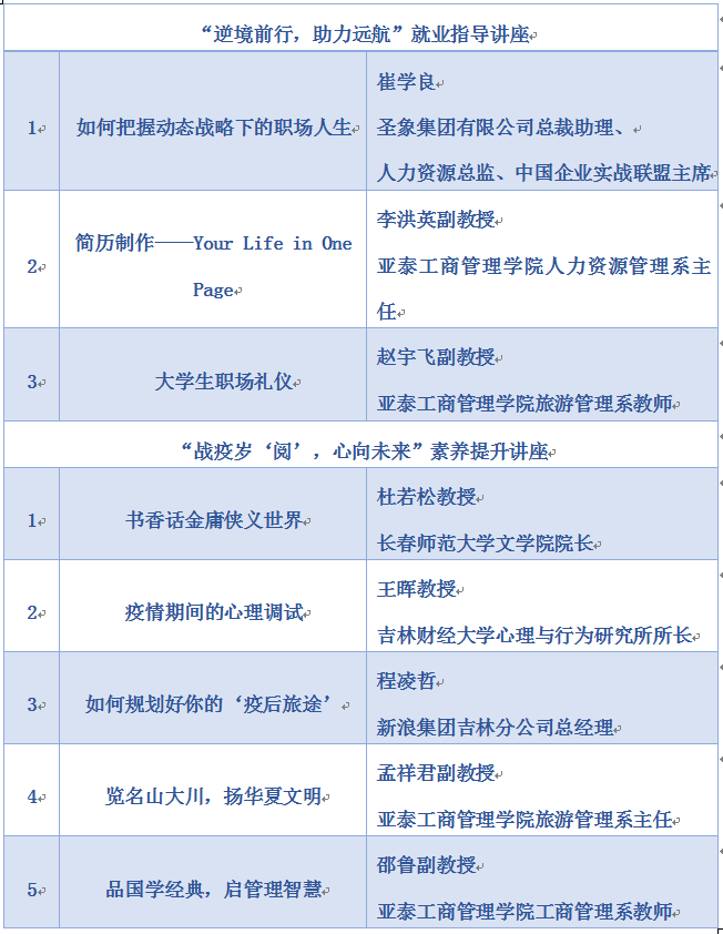本网讯(亚泰工商管理学院 供稿)为有效做好疫情防控期间学生思想政治工作,丰富同学们校园静态管理期间学习生活,确保学生身心健康,3月26日至4月9日,亚泰工商管理学院邀请校内外专业名师举办“名师领航,共盼春来”名家系列讲座。