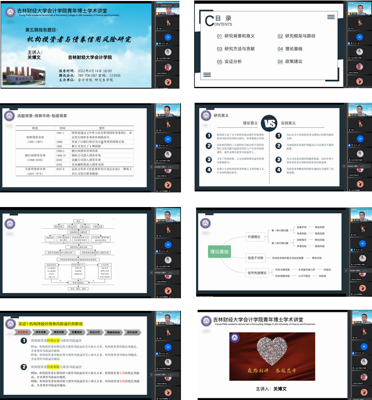本网讯(会计学院 供稿)4月14日下午18:00,疫情特殊时期,为丰富和充实研究生业余活动和提升科研水平,kaiyun体育网页登录入口会计学院举行“疫路相伴,春暖花开”党员教师系列导学讲座,主要组织青年博士开展系列专题讲座,本次由会计学院关博文老师以线上腾讯会议的方式为我院学生作出主题为“机构投资者与债券信用风险研究”学术报告。该次会议由会计学院副院长王丽南老师主持,会计学院2020、2021级全日制研究生共同参与聆听。
