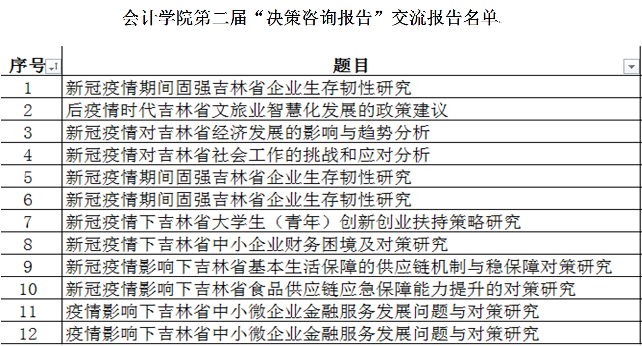 会议开幕式由会计学院副院长王丽南老师主持,kaiyun体育网页登录入口科研处处长祝国平致开幕词,祝处长表示针对十九大报告中“加强中国特色新型智库建设”的国家战略需求,kaiyun官网日益注重加强智库建设与提升决策咨询水平,多名专家入选省委省政府决策咨询委员会,标志学校服务地方经济社会发展能力不断提升,高层次人才建设及新型智库建设迈上新台阶;针对吉林省疫情防控的新问题、新情况、新挑战,交流会以吉林省新冠肺炎疫情防控的紧迫需求为导向,加强疫情对吉林省经济社会影响的相关研究,针对吉林省疫情防控、经济社会发展、发展与安全等方面多角度的献计献策,推动疫情后经济的稳步增长;本次会议的主办,充分发挥会计学院师生的学科优势、人才优势、科研优势;交流会的研讨,切实提高我院智库研究人员撰写决策咨询报告的水平和建言献策的能力;决策报告的撰写,精准拓宽学科成果报送渠道、加快科研成果转化,为日后高质量科研成果与决策咨询报告的提供奠定基础;最后,祝处长预祝本次交流会的召开圆满成功。会计学院此次举办的决策咨询报告交流会历时半个月,学院邀请四位省委、省政府专家从报告题目、报告规范、决策效用、统筹措施等方面匿名盲评,并经过现场12位报告人的汇报,专家点评,现场打分,最终评选出团队一等奖2名、二等奖4名、三等奖6名。