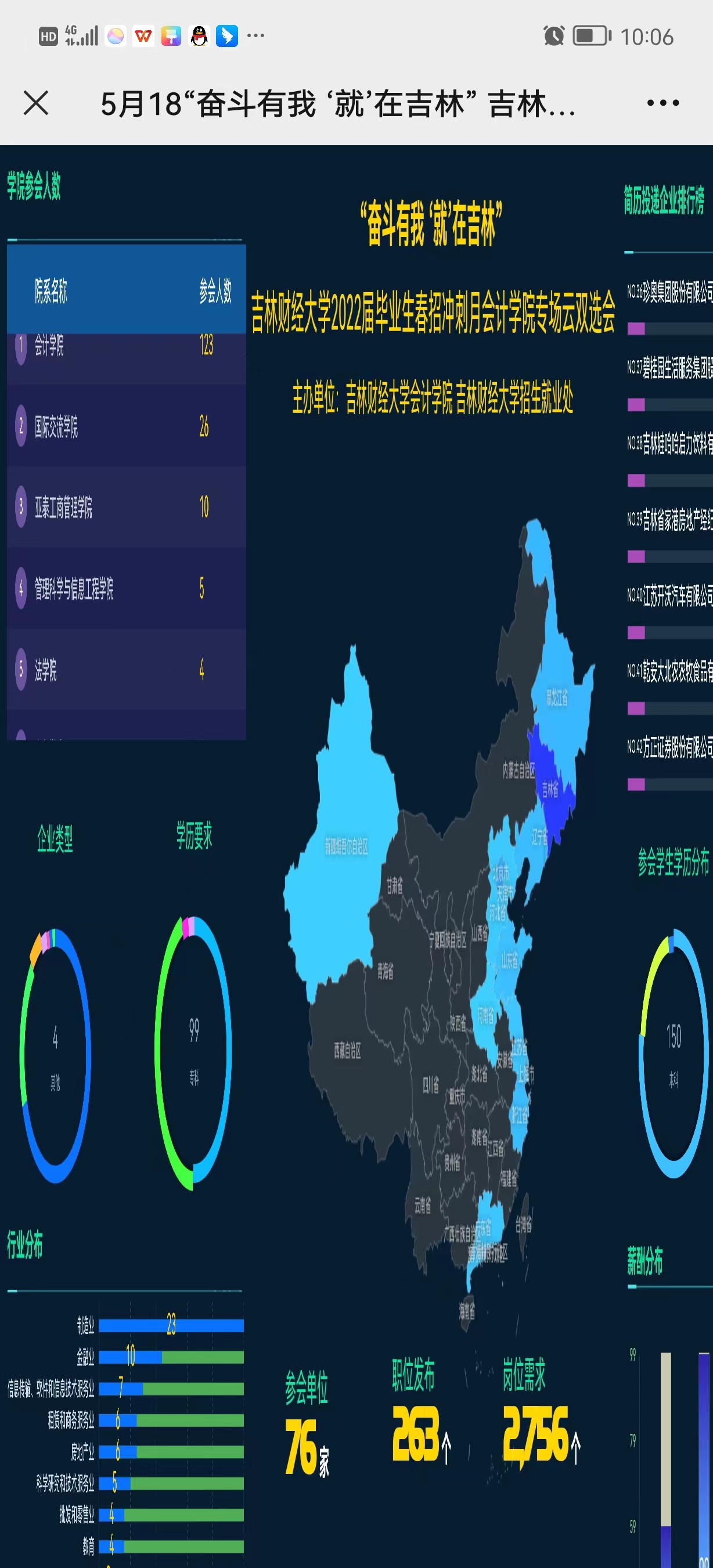 本次云双选会采取网上报名、线上会议的形式,进一步开源拓岗,深化校企合作,会议共邀请到76家企业参加,提供可选各类岗位2756个,能够满足毕业生的多元就业需求。18日上午共有234人参与到本次双选会中。单位先后向师生介绍发展情况、宣讲招聘计划、收取简历材料,单位通过线上形式对学生进行一对一的答疑解惑。充足的就业岗位和就业信息进一步缓解了毕业生的焦虑心态。