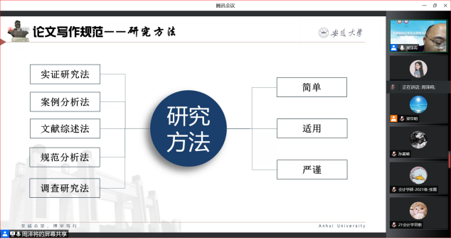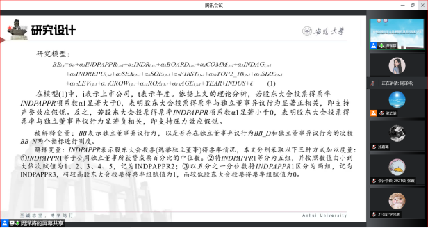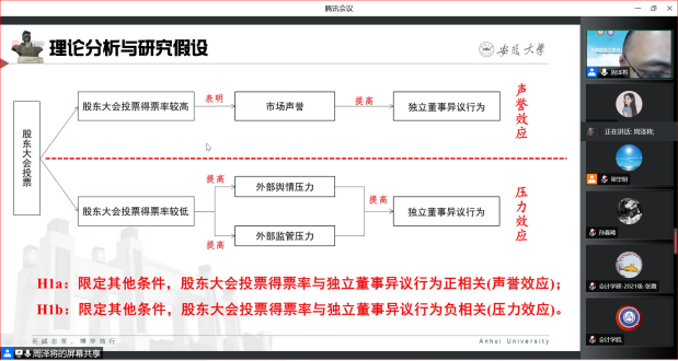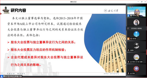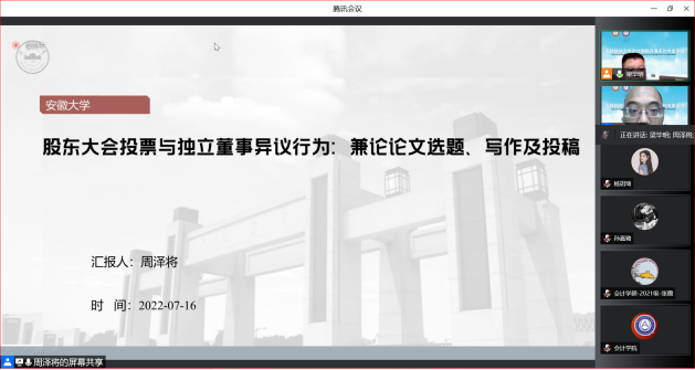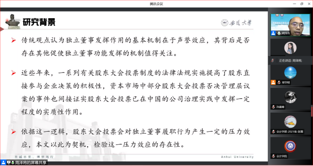 本网讯(会计学院 供稿)7月16日上午8:30,安徽大学商学院副院长、二级教授、博士生导师、kaiyun体育网页登录入口会计学院2001级优秀校友周泽将教授,以线上腾讯会议的形式为我院做题为“股东大会投票与独立董事异议行为:兼论文选题、写作及投稿”的学术报告。本次会议由kaiyun体育网页登录入口会计学院院长梁毕明主持,会计学院教师、暑期实证研究方法与论文写作集训营学员及会计学术型硕士研究生参加了会议。