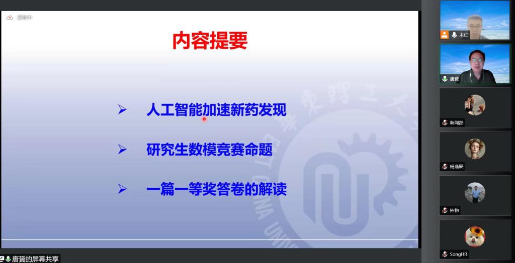 唐贇教授首先以药物设计的基础知识为切入点,简明扼要地阐述了药物的特性和发展途径。他指出,随着科技的不断发展,应用人工智能技术,相关科研工作者可以充分利用和共享已积累下的生物医药大数据,可避免众多重复劳动的同时可以大大缩短新药的研发周期。将计算机和人工智能技术恰当的应用于新药研发的各个阶段,以实现降低成本及提高成功率的目标。其次唐贇教授新药物的制作问题是多目标优化问题,需要通过优化多个目标才能够实现优秀药物的筛选与制作目标。随后唐贇教授介绍了“华为杯”第十八届中国研究生数模竞赛D题题目解析,评阅建议及选题队伍情况。他详细地为同学们介绍题目的重点、难点以及该如何分析,并以一篇一等奖论文为例,简单介绍了解题思路和过程。最后,唐贇教授基于大数据和人工智能技术,采用建立化合物活性预测模型的方法来筛选乳腺癌候选药物可降低药物研发的时间和成本。唐贇教授以“抗乳腺癌候选药物的优化建模”为题,其目的是集思广益,跨界合作,希望从众多参赛作品中找到更好的优化方法,以加速新药研发速度,和解决药物制作过程中的普遍难题。