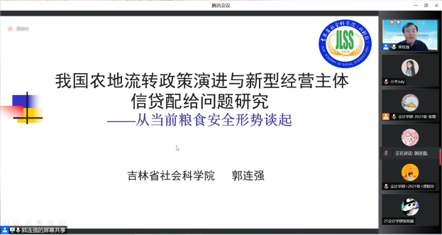 本网讯(会计学院 供稿)2022年8月6日上午9:00,经济学博士、吉林省社会科学院副院长郭连强,以线上腾讯会议的形式为kaiyun官网会计学院作题为“我国农地流转政策演进与新型经营主体信贷配给问题研究—从当前粮食安全形势谈起”的学术报告。本次报告由会计学院副院长李阳主持,学院教师、暑期实证研究方法与论文写作集训营学员及会计学术型硕士研究生参加了报告会。