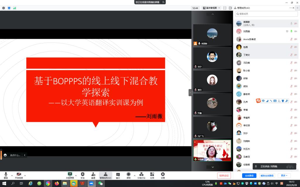 接着,公共外语教研部刘宁、刘雨薇、石莹、李晨希分别从各自的教学实践,依托大学英语系列课程从U校园智慧教学平台的使用、BOPPPS教学模式的应用、互动式教学方法以及多元过程性评价等方面做了分享。