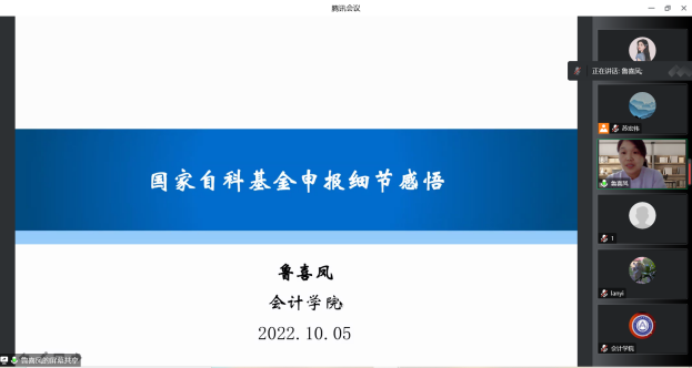 本网讯(会计学院 供稿)10月5日,会计学院举办2023年“两金”项目申报(线上)系列辅导会。学院副教授鲁喜凤作了“国家自然科学基金申报细节感悟”主题学术报告,学院筹备申报“两金”项目的部分教师与2020、2021级全日制学术研究生参加了报告会,会议由会计专硕教育中心主任苏宏伟主持。