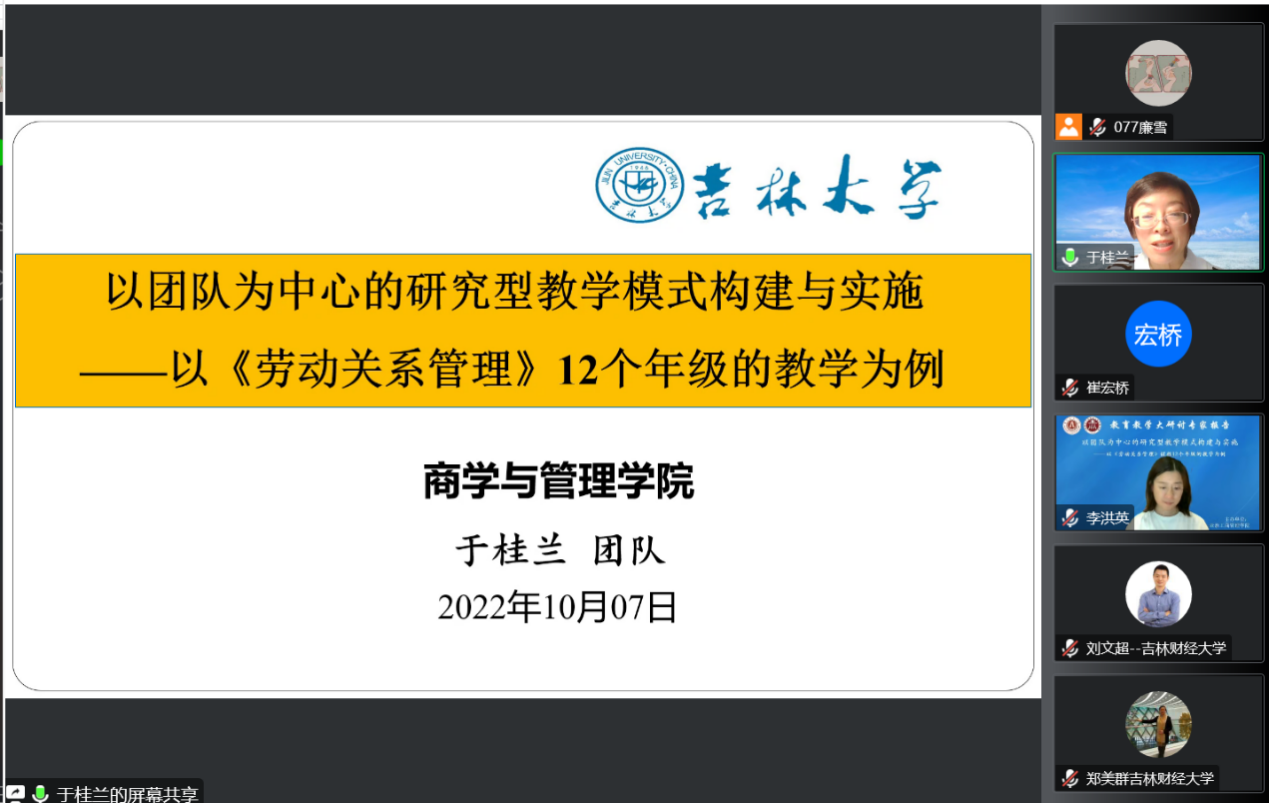 本网讯(亚泰工商管理学院 供稿)按照《kaiyun体育网页登录入口本科教育教学审核评建暨“育人立校”本科教育质量提升行动方案》《kaiyun体育网页登录入口本科教育教学大研讨工作方案(征求意见稿)》工作安排,为全面落实学院本科教育教学大研讨工作方案,亚泰工商管理学院特邀请吉林大学商学与管理学院教授、博士生导师于桂兰教授于10月7日晚上作了题为《以团队为中心的研究型教学模式构建与实施——以<劳动关系管理>课程12个年级的教学为例》的报告。教育教学大研讨专家报告由院长崔宏桥教授主持,学院全体教师线上参加了本次活动。
