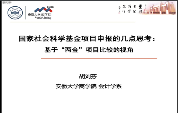 本网讯(会计学院 供稿)11月2日,会计学院邀请安徽大学商学院会计学系主任胡刘芬副教授,以腾讯会议的方式为学院师生作“国家社会科学基金项目申报的思考:基于‘两金’项目比较的视角”的主题学术报告。报告会由会计专硕教育中心主任苏宏伟老师主持,会计学院教师、2021级、2022级全日制学术研究生参加了辅导会。
