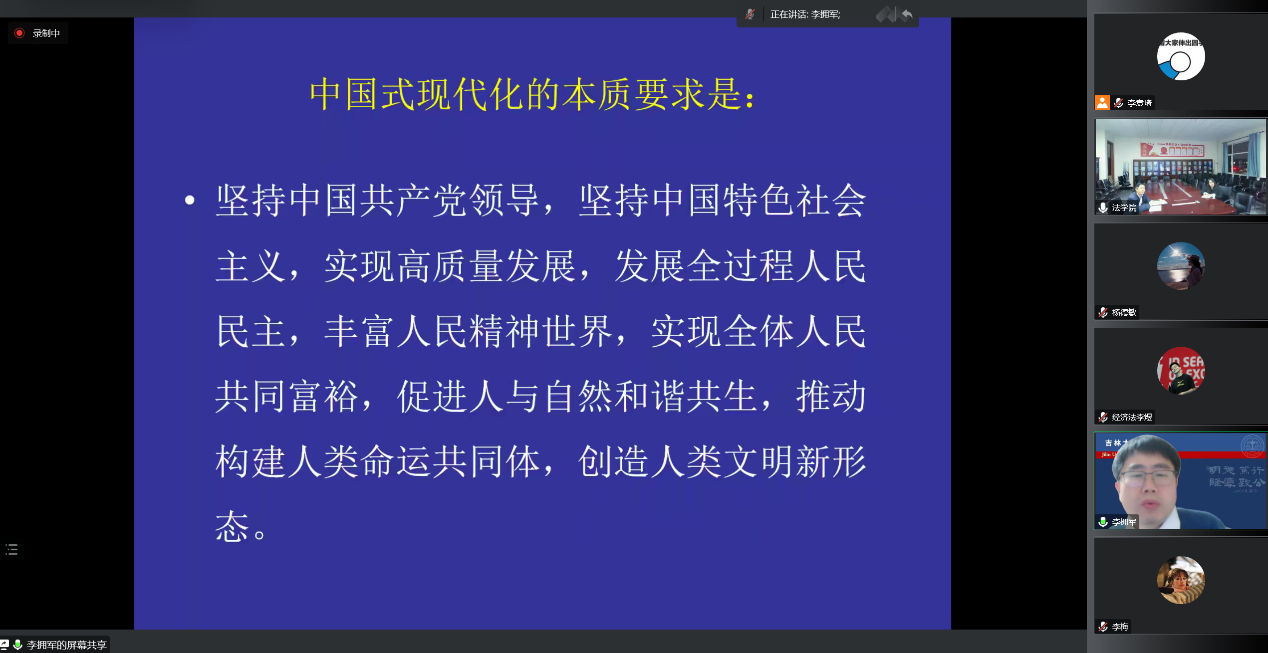 本网讯(法学院 供稿)2022年11月25日晚,吉林大学法学院教授、博士生导师李拥军教授受邀为法学院师生作“法治现代化的‘中国式’内涵和具体面向”线上专题讲座,学院党委书记高原主持本次讲座。法学院部分教师、本科生及研究生共计100余人在线参加讲座。
