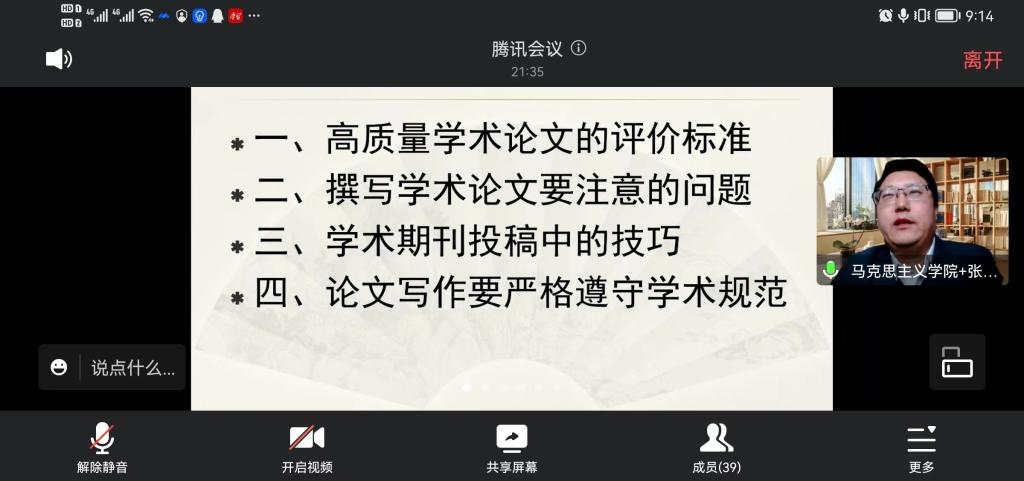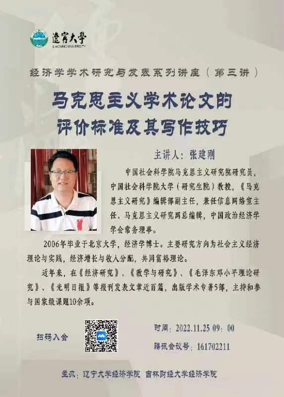 本网讯(经济学院 供稿)为切实加强高校之间的学科联系,进一步提升科研团队学术水平,11月25日上午,学校经济学院和辽宁大学经济学院联合举办学术系列讲座。中国社会科学院马克思主义研究院研究员,中国社会科学院大学(研究生院)教授张建刚,作了题为“马克思主义学术论文的评价标准及其写作技巧”的线上学术报告。辽宁大学经济学院师生、kaiyun官网经济学院全体教师和研究生,其他学院部分师生参加了报告会。报告会由辽宁大学经济学院副院长和军教授主持。