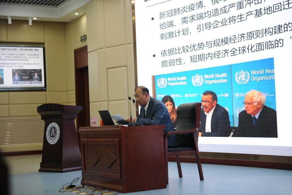 首先,刘兆国副教授从国内增加值(DVA)贸易网络演进和国外增加值(FVA)贸易网络演进两部分对全球价值链网络演进和东亚价值链刻画做出分析,并指出中国在全球价值链动态演进中扮演着越来越重要的角色,已经成为全球价值链中重要的需求、供给中心,同时也是连接发展中国家与发达国家价值链的“共轭环流”枢纽。随后他介绍了东亚价值链重构的时代背景,并从中国在全球价值链中的价值引领能力和地位、为东亚经济体提供的消费市场空间等角度深刻论述中国推动深化东亚区域价值链合作的现实基础。最后,他逐一分析了中国在推动深化东亚价值链合作中可能面临的障碍,并提出四条切实可行的路径选择。报告从各视角向在场师生全方位讲述了中国在东亚价值链重构中的角色与作用。会后,有多名同学向刘兆国副教授提出相关领域的问题,刘兆国副教授耐心地为同学们解答。