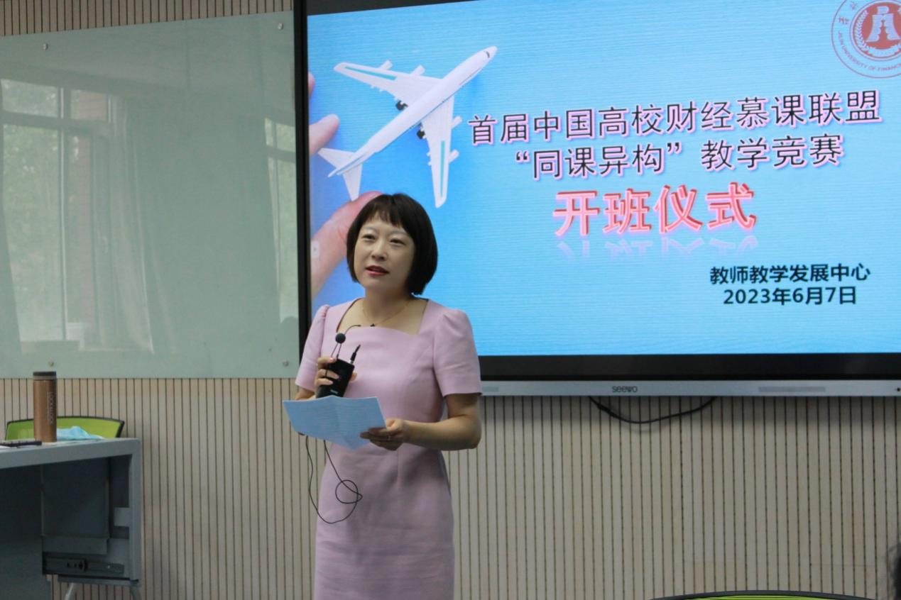 开班仪式上,曹忠威介绍了首届中国高校财经慕课联盟“同课异构”教学竞赛的基本情况与竞赛规程。曹忠威指出,竞赛旨在落实立德树人根本任务,助力财经类高校的一流课程、一流专业和一流师资建设,提高人才培养质量,构建骨干教师交流学习平台。每个参赛高校参加管理学、基础会计、金融学、政治经济学、数理统计五门财经类高校专业核心课程的展示,展示内容为整体课程思政设计和实施。她表示教学比赛在学校整体推动教学创新,建设高质量教育体系的进程中起着十分重要的作用。本次大赛将为广大财经专业教师提供研究教学,开展教学创新,实现创造新业绩的交流平台;也将成为财经类专业课程教学改革与课程思政探索创新交融互惠、互学互鉴平台。希望参赛教师和团队认真备赛,力争把最优秀的作品展现在比赛现场,在大赛中充分展现综合教育教学素养,争取在比赛中有所收获。同时,希望参加观摩的新任教师能够在思想上高度重视做好准备,行动上认真落实强化课程育人,专业上精进不休臻于至善,上好课程思政如何更好地融入财经类课程第一课。