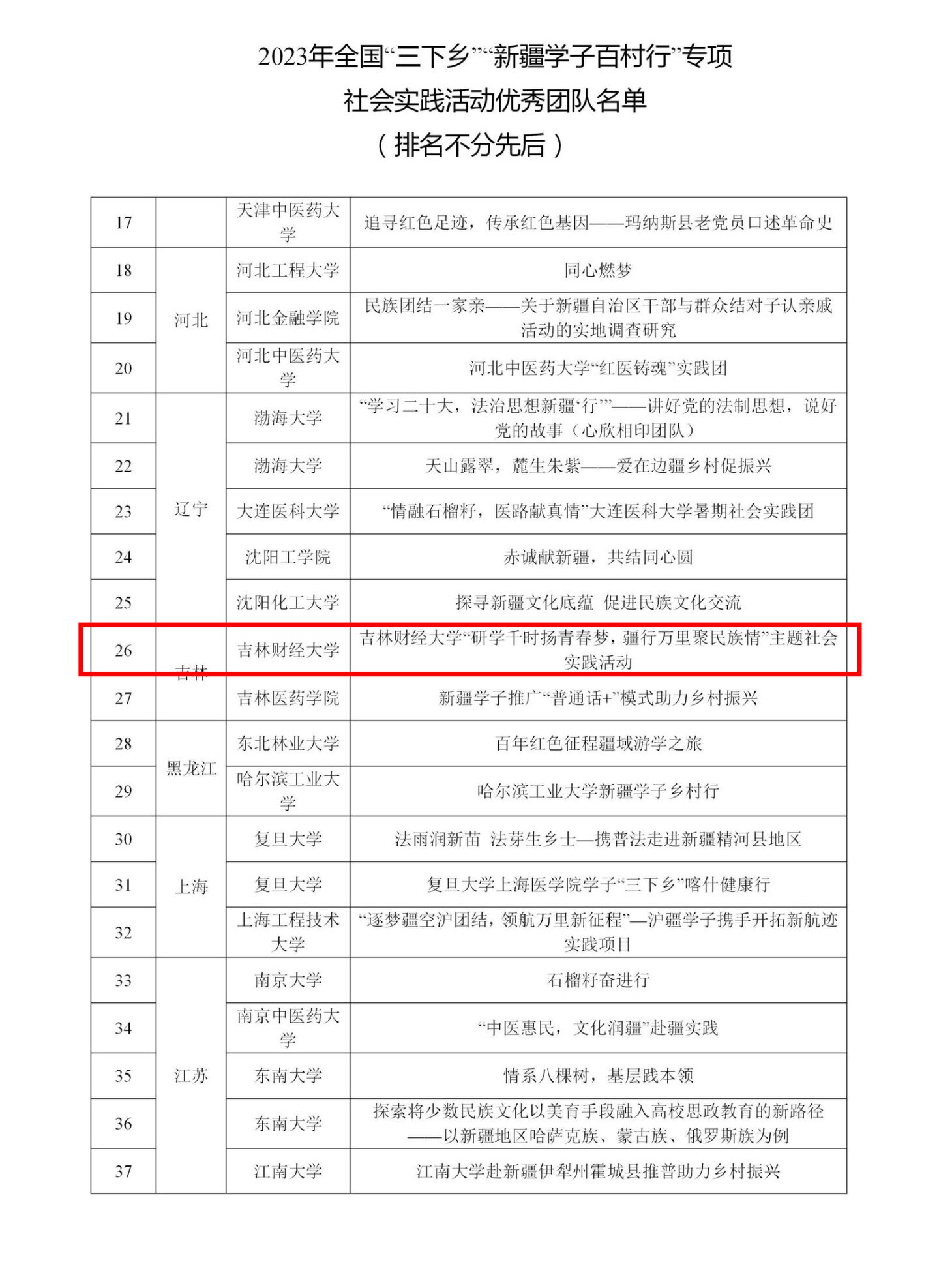 本网讯(校团委 供稿)近日,由新疆维吾尔自治区团委传来消息,kaiyun官网税务学院“吉心向党,税愿华夏”民族团结实践团荣获2023年全国“三下乡”“新疆学子百村行”专项社会实践活动优秀团队称号。