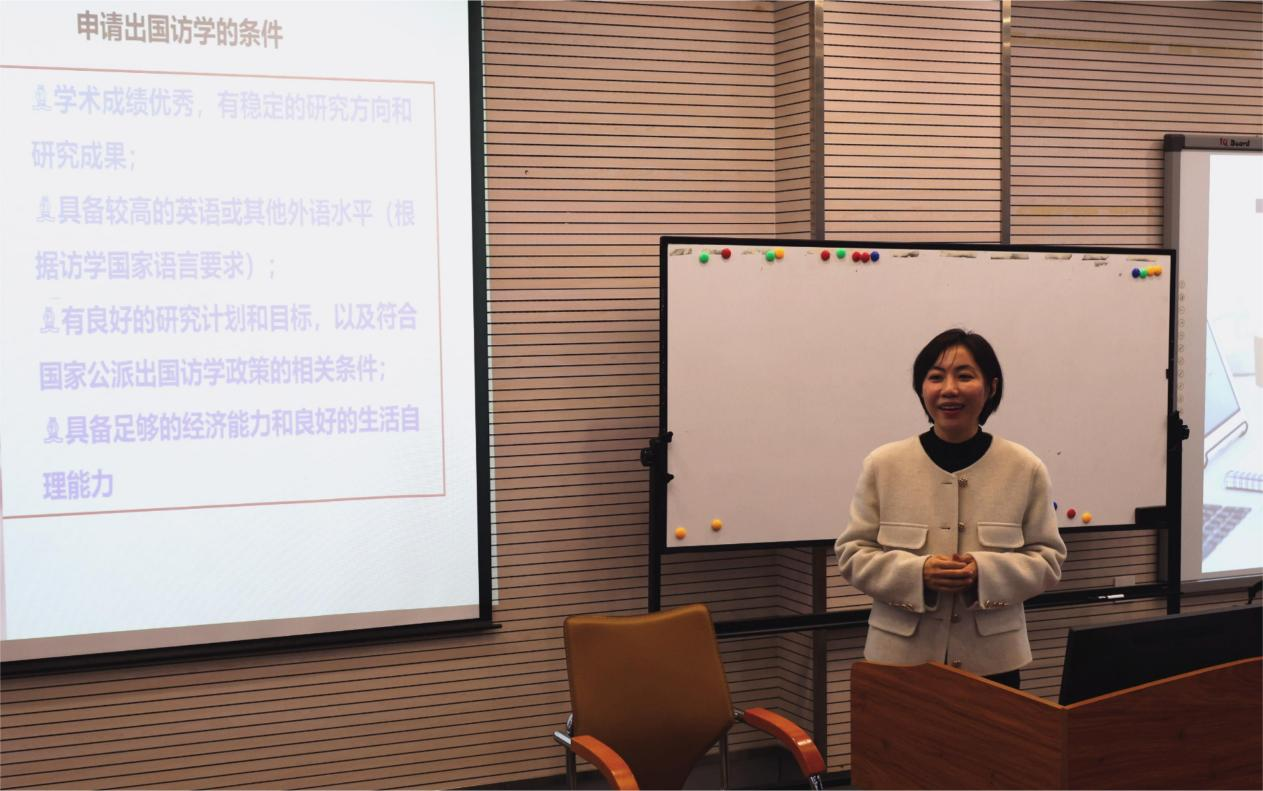 张池军老师以《海外学术研究关系建立心得》为主题做了经验分享。她于2015年获国家留学基金委访问学者项目资助1项,赴美国得克萨斯大学奥斯丁分校交流访学,并于2022年、2023年赴香港大学进行短期交流访学。她结合自身求学经历,向参会教师提供了寻找海外合作导师资源以及将访学研究成果转化为科研产出的新思路,讲述了通过发挥学科交叉优势增强学术影响力的路径,并对于如何申报国家留学基金委的访学研修项目提出了指导性的建议。她表示十分感谢学校向老师们提供的访问学习机会,希望老师们能充分利用这些机会促进自身发展,为学校各项事业的高质量发展贡献力量。