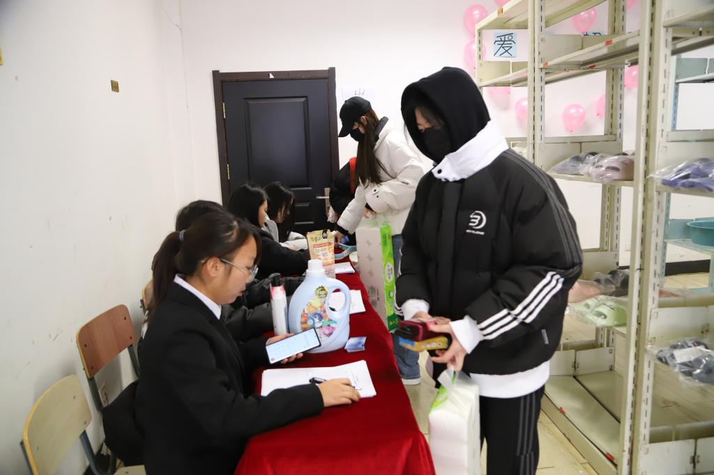 本次活动现场摆放着几十种、千余件生活用品,同学们参与热情高涨,纷纷使用学院分发的专用代金券进行爱心采购。