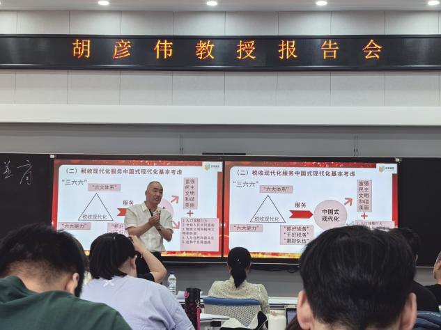 本网讯(税务学院 供稿)6月12日,税务学院邀请学校优秀校友、国家税务总局辽宁省税务局原一级巡视员胡彦伟教授,作“税收现代化服务中国式现代化的若干思考”专题学术报告。