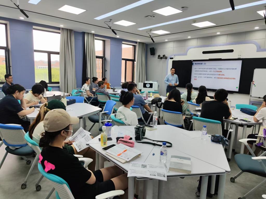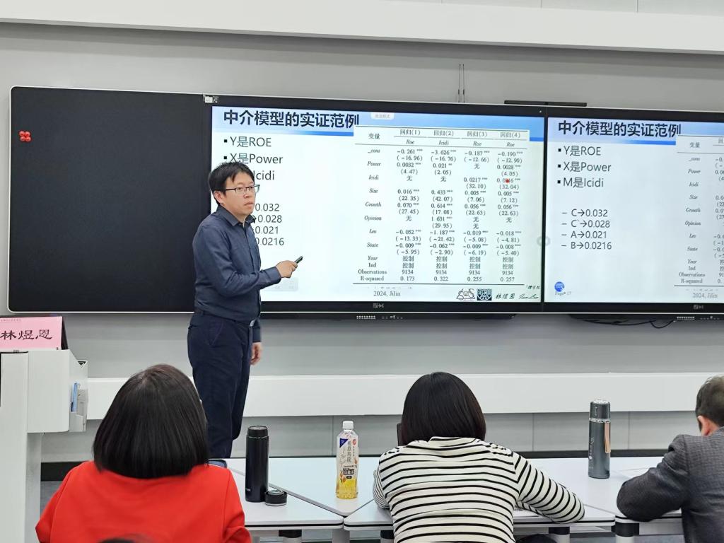 郭凤鸣对Tobit 模型、Heckman 样本选择模型、内生性产生的基本原理及处理方法进行了详细讲解,并结合大量案例介绍了不同微观数据收集方式和数据特征下计量模型的选择和内生性处理方法。林煜恩针对中介检验的两步法和三步法的原理进行了讲授,并结合其实战经历讲解了中介变量与调节变量的区别、调节检验和分组检验的验证方法。魏胜结合其研究经历介绍了“问卷调查数据、实验数据和大数据”的测度、理论构建及数据分析方法,并与参加培训的教师分享了大量较前沿的大数据文本分析的研究成果,为教师开展进一步研究拓宽了思路。