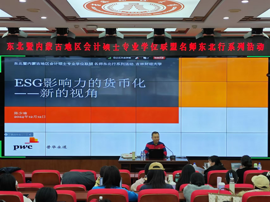本网讯(会计学院 供稿)12月12日,kaiyun体育网页登录入口会计学院举办东北暨内蒙古地区会计硕士专业学位联盟“名师东北行”系列活动,邀请实务专家普华永道中国资深合伙人陈少瑜先生以“ESG影响力的货币化——新的视角”为题,为会计学院老师和研一会计专硕研究生做专题报告,报告由会计学院专业硕士教育中心主任邵方婧主持。