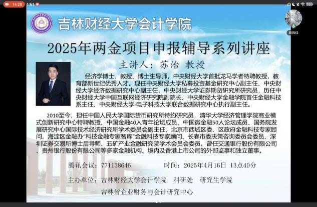 本网讯(会计学院 供稿)为提升教师科研项目申报质量,4月17日下午,会计学院举办2025年国家社科基金项目线上申报指导会,邀请中央财经大学苏治教授担任主讲嘉宾,为学院教师开展一对一精准辅导。
