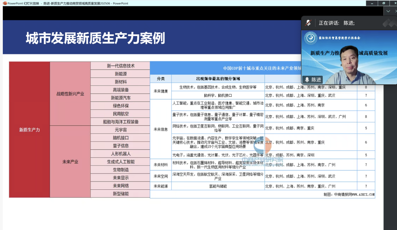 陈进立足全球经贸变局,系统阐释了新质生产力的核心内涵及其在商贸领域的转型路径。他强调新质生产力对商务发展至关重要,其核心要素包括数字素养、跨学科能力及创新创造能力,分析了全球贸易与电商格局及国家电商战略,并结合案例阐述了新质生产力在各个领域和平台的大模型应用。此外,他还从商务领域、企业和城市发展等角度,进一步剖析了新质生产力与商务发展的关系,指出未来人才培养面临的机遇与挑战,并提出教育需优化人才培养方向以应对全球商务新趋势。