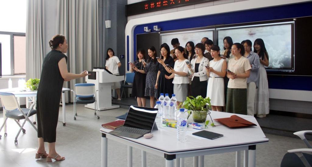 活动特邀东北师范大学传媒科学学院院长、博士生导师史册教授担任主讲,她从声音的专业理论知识讲起,深入剖析声音在教学中的重要作用以及如何通过声音提升教师魅力。史册采用灵活多样的互动式教学方法,从“内三”(内在语、情景再现、对象感)“外四”(停连、语气、重音、节奏)阐释教师如何进行科学发声、艺术用嗓。她鼓励教师们在课堂表现要“高于生活、低于舞台”,并结合自身丰富经验,运用多个教学案例,通过讲解与示范相结合的方式,介绍了戏剧教学法对于提升教师魅力的应用。