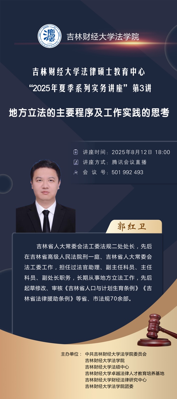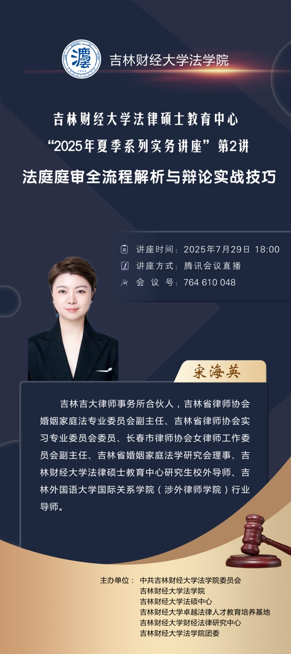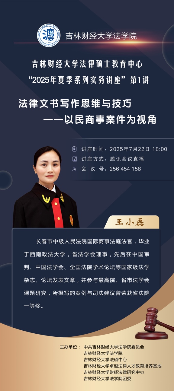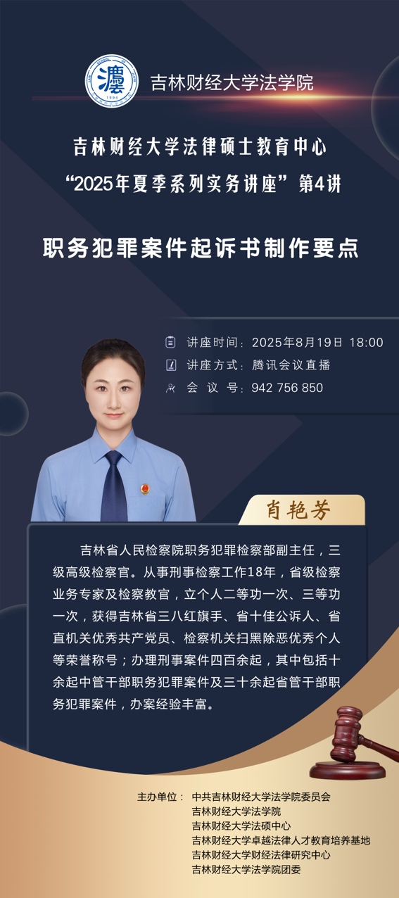 本网讯(法学院 供稿)7月22日至8月19日,kaiyun体育网页登录入口法律硕士教育中心“2025年夏季系列实务讲座”成功举办。本期讲座共四讲,分别邀请长春市中级人民法院国际商事法庭法官王小磊、吉林吉大律师事务所合伙人宋海英、吉林省人大常委会法工委法规二处处长郭红卫、吉林省人民检察院职务犯罪检察部副主任肖艳芳主讲,以“法律文书写作思维与技巧——以民商事案件为视角”“法庭庭审全流程解析与辩论实战技巧”“地方立法的主要程序及工作实践的思考”“职务犯罪案件起诉书制作要点”为题展开。法学院师生积极参与,讲座学术氛围浓厚。
