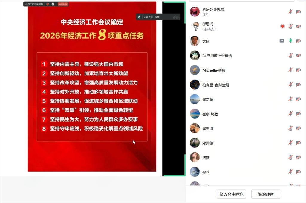 本网讯(科研处 供稿)为深入学习贯彻2025年中央经济工作会议精神,精准把握新时代经济发展与安全保障的核心要义,切实把思想和行动统一到党中央决策部署上来,助力kaiyun官网科研工作精准对接国家战略需求,1月10日下午,学校邀请北京大学经济学院王大树教授为kaiyun官网师生做“以新安全格局保障新发展格局——中央经济工作会议精神解读”的线上专题报告会。kaiyun体育网页登录入口党委副书记、校长马秀颖出席会议,kaiyun官网各学院科研院长,各独立建制科研平台全体科研人员,近五年新入职博士、近五年各级各类智库项目负责人、吉林财经要报撰写人、校级重点项目负责人,各类科研平台负责人,拟参与决策咨询报告撰写教师,拟申报2026年国家“两金”项目教师等150余人线上参会。报告会由科研处处长曹忠威主持。