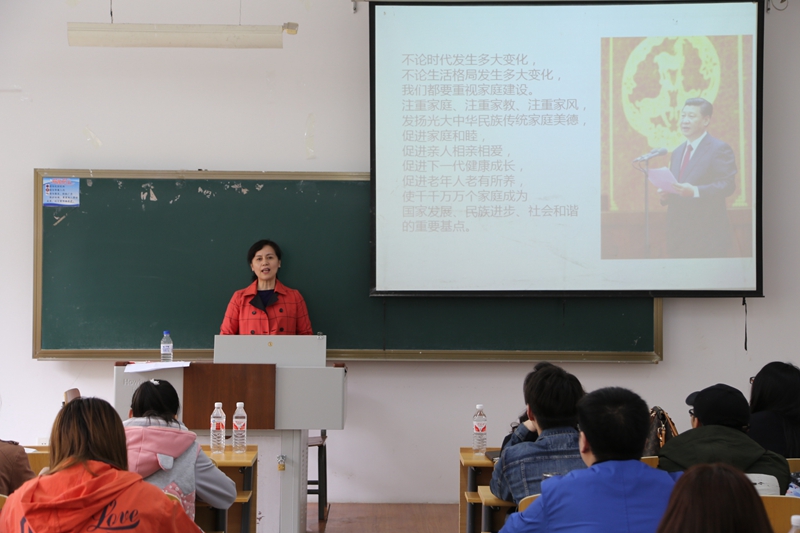 衣庆岩处长在讲堂开篇引用了习近平总书记关于重视家庭建设的重要讲话,强调家庭发展的重要性,指出了家庭建设是国家发展、民族进步、社会和谐的重要基点。然后,本着其对对国家人口政策、失独家庭政策、医养结合政策、健康中国政策、家庭健康扶贫等政策的把握和研究,她从家庭人口政策对国家经济社会发展的深刻影响,谈到目前中国人口老龄化的严峻现实;从居家养老谈到医养结合的重要性,进而对如何加强和完善医养结合提出了很多建设性的想法。她对青年学生的能力培养提出三点建议和希望:一是要树立服务意识;二是要志存高远;三是肩负使命,学会承担责任。
